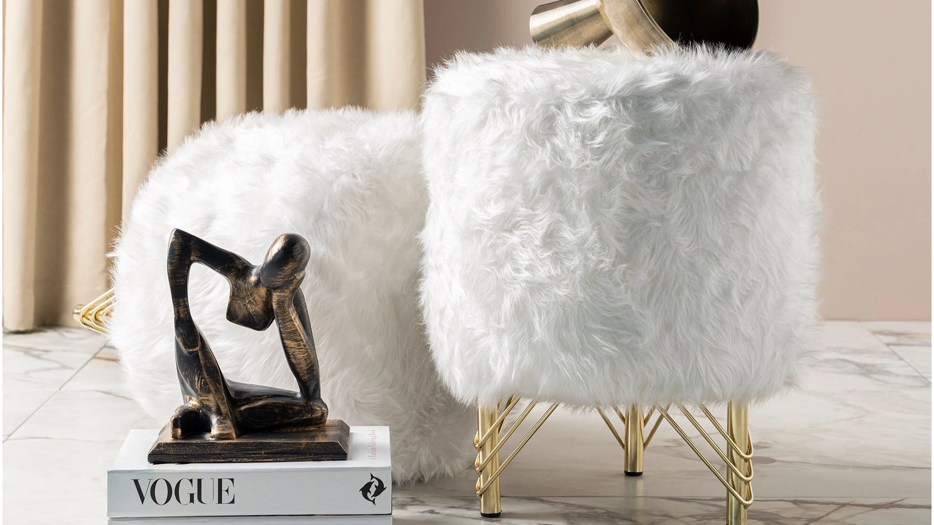 Aida Puf, beyaz ve gold renklerinin uyumuyla evinize şık bir dokunuş yapıyor.