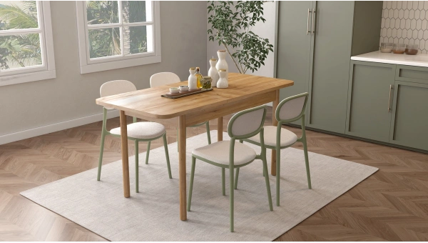 Almin sandalye, zarif formu ve nil yeşili iskeletiyle mutfak dekorasyonuna canlı bir dokunuş katıyor. Hem Almin hem de Ades mutfak masasıyla kombinlenebilir, farklı tarzlara uyum sağlayabilir.