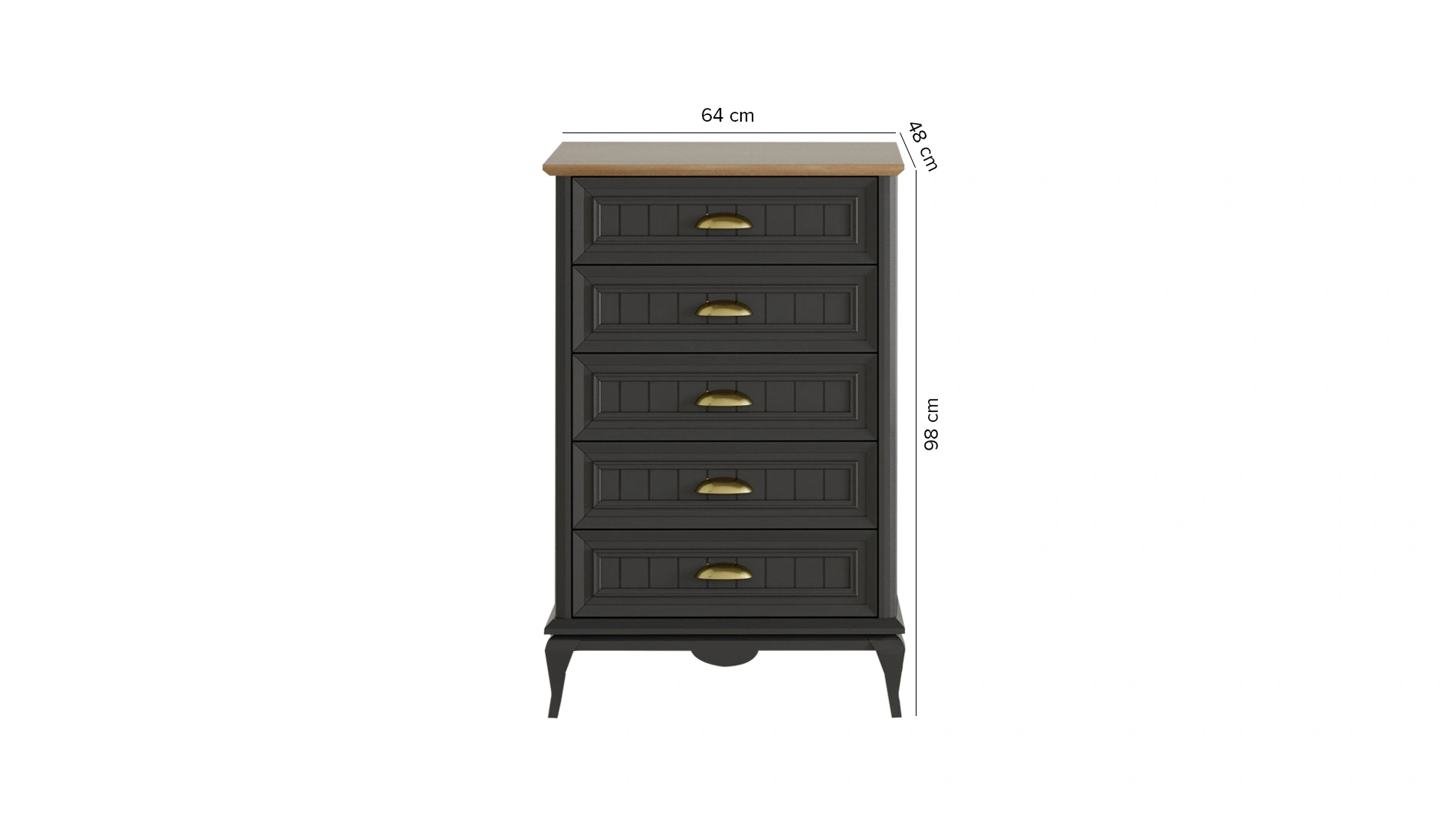 Eskitme meşe rengi ile fümenin birleştiği tasarımıyla göze çarpan Angelic Dark Dar Şifonyer, çizgisel hatlarıyla şık ve dinamik bir yapıya sahip. Yüksek ayakları ve gold kulpları yatak odanızın en şık parçası olmaya hazır.
