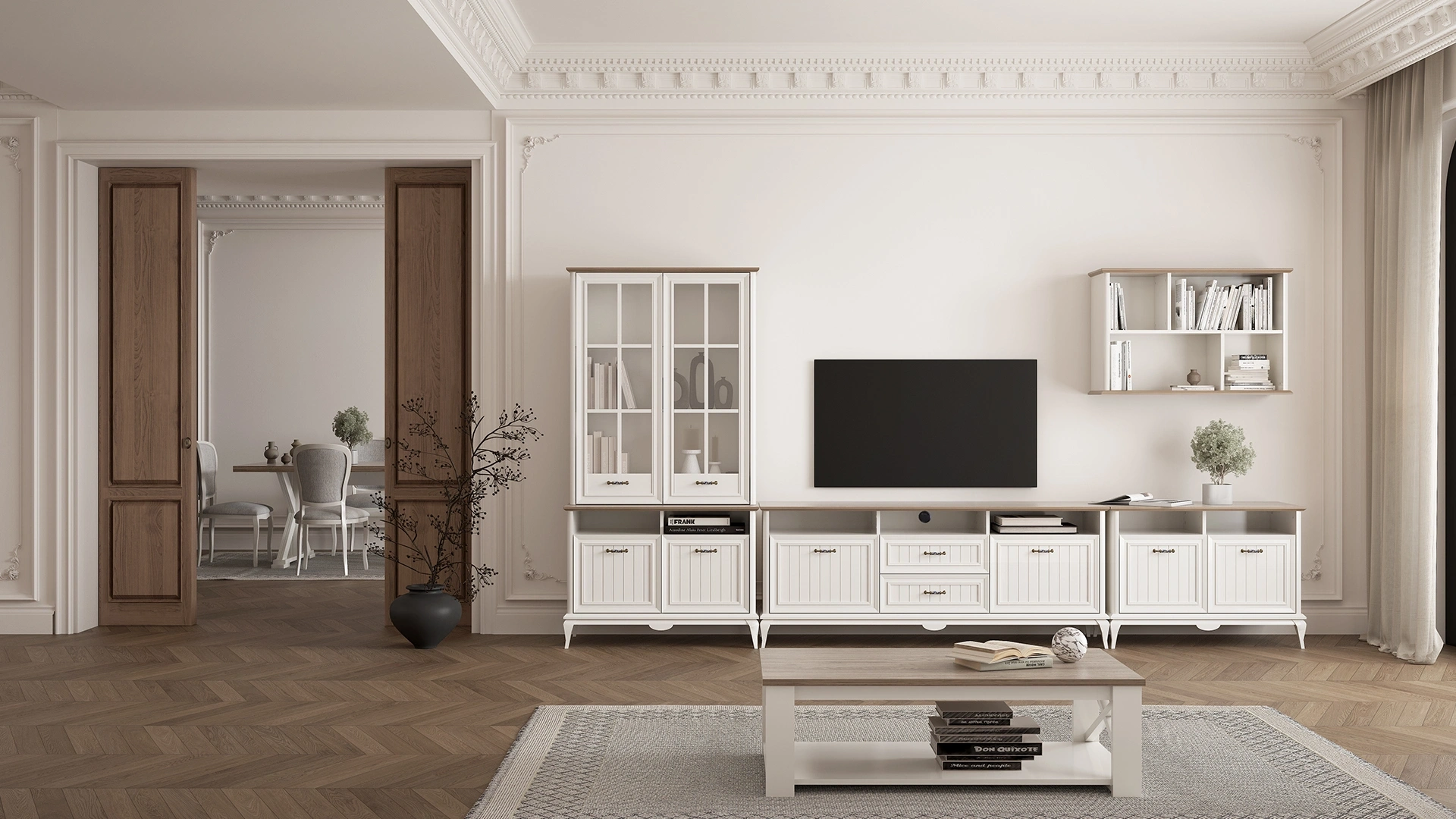 Country tarzıyla dikkat çeken Angelic Tv Ünitesi, porselen kulplarla hareketlendirilen beyaz rengiyle salonunuza şık bir dokunuş yapıyor. Çekmeceli, kapaklı ve açık bölmeleriyle eşyalarınız ve objeleriniz için ekstra alan sağlayan Angelic Tv Ünitesi, sıcaklığı ve şıklığı salonunuza taşıyor.