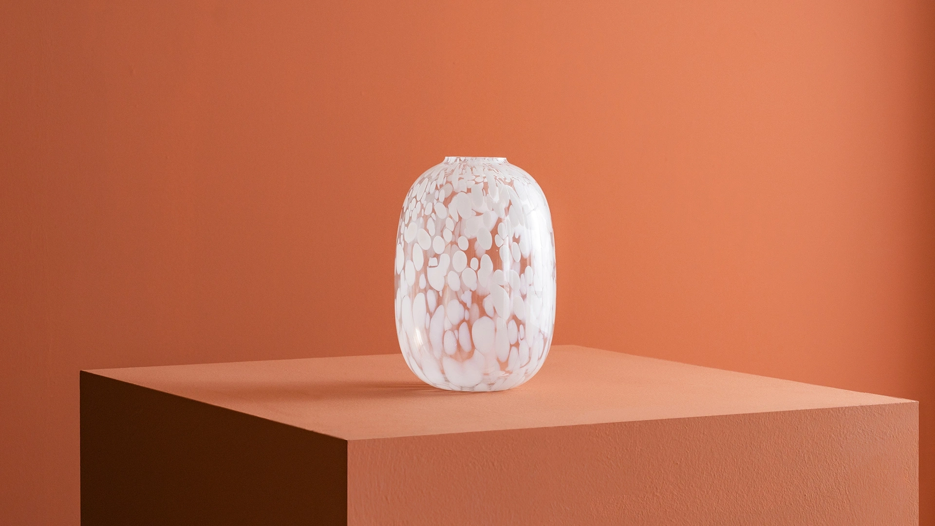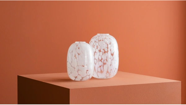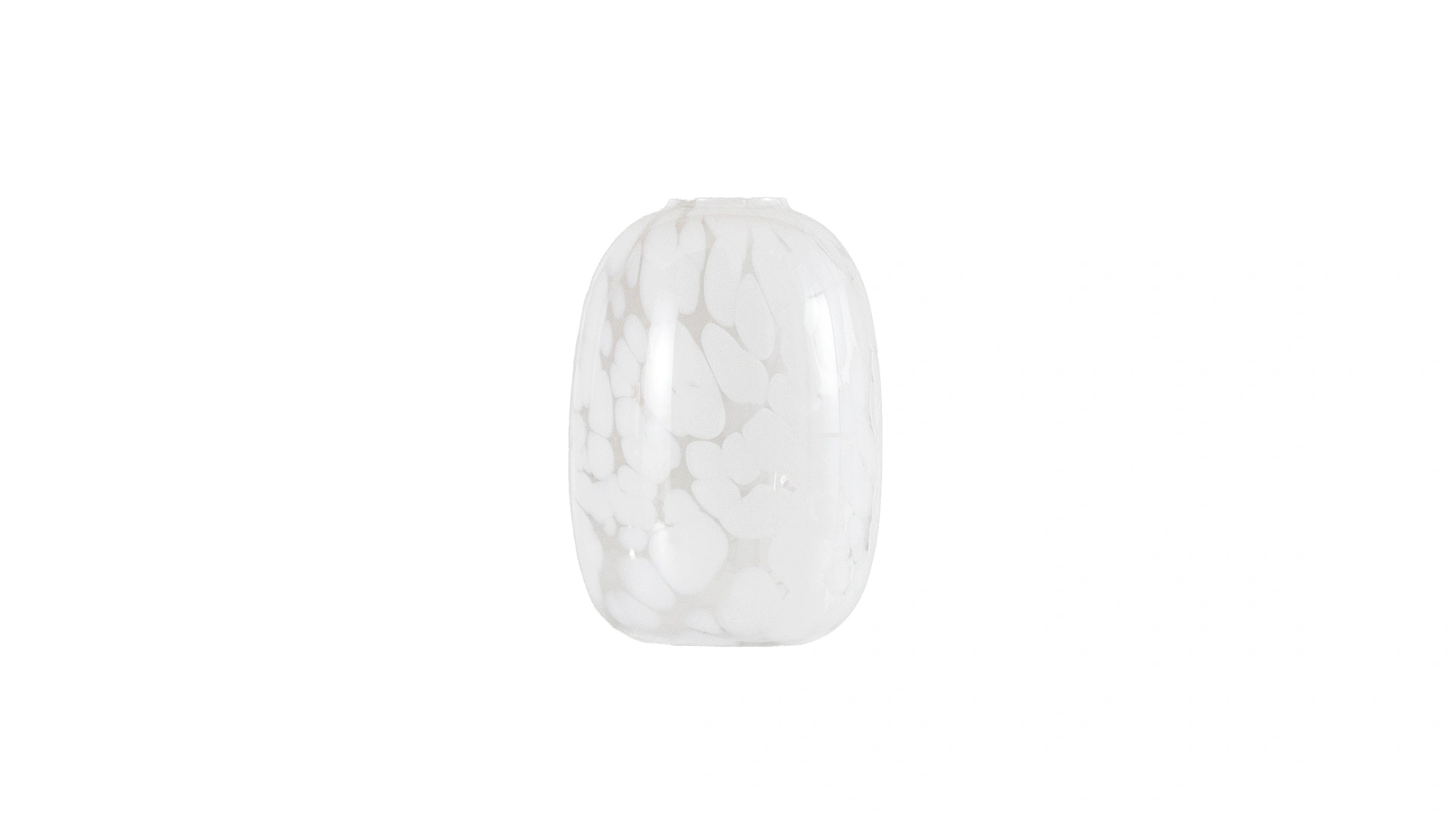 Bianco Cam Vazo, pamuksu beyaz deseni ve pürüzsüz yüzeyiyle minimalist bir şıklık sunuyorken, silindirik formuyla çiçeklerinizi zarifçe sergiler.