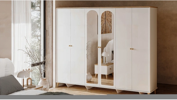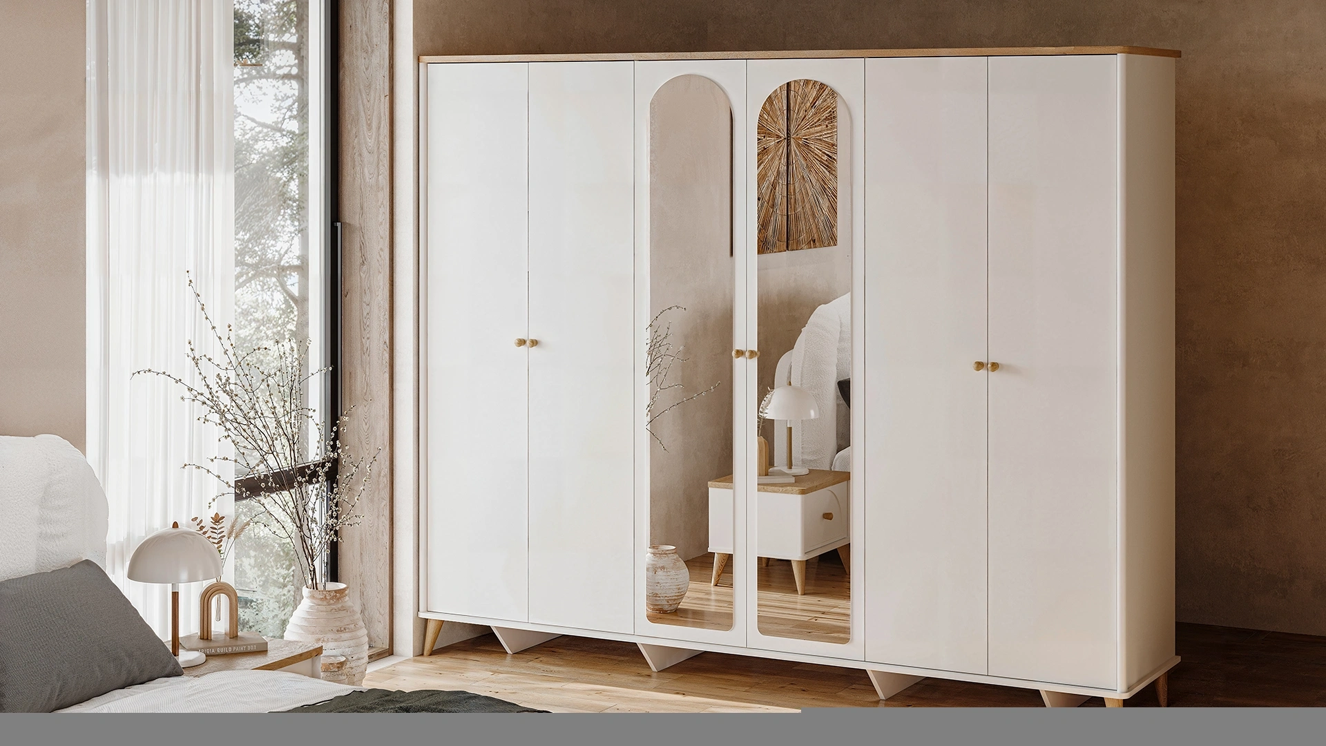 Maksimum depolama kapasitesi sunan 6 kapaklı dolap, geniş yatak odaları için kapsamlı bir çözüm sunar. Kapaklarda yer alan kubbe formundaki ayna detayı, Bohemia koleksiyonuna özgü ikonik bir dokunuş katarken, dolabın kullanım alanını da genişletir. Dolap içindeki LED aydınlatmalı askı boruları ve raflar sayesinde eşyalarınızı kolayca organize edebilirsiniz. Yerden yüksek yapısı ve modern tasarımıyla estetik ve işlevselliği bir arada sunar.