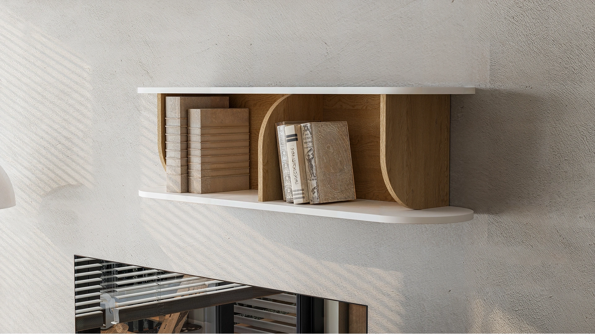 Bohemia TV Ünitesi Takımı, geniş alt ünitesi, tamamen açık üst modülü, fonksiyonel kitaplığı ve tamamlayıcı sehpa alternatifleriyle salonlara hem estetik hem de işlevsel bir çözüm sunar. Beyaz ve meşe uyumuyla modern bir atmosfer yaratırken, kapaklı ve açık alanları dengeli bir şekilde kullanarak düzenli bir görünüm sağlar. Farklı sehpa seçenekleri ve geniş kitaplığı, hem dekoratif hem de pratik çözümler sunar.