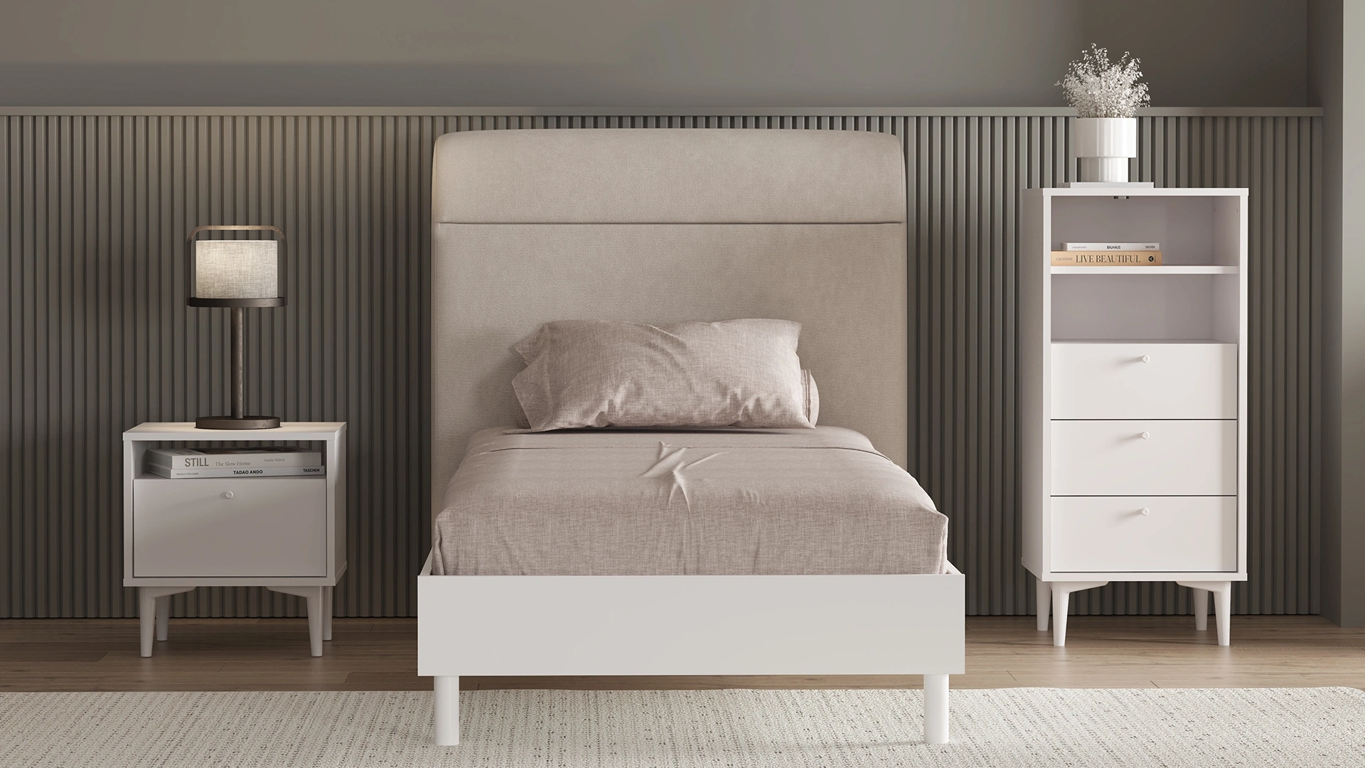 Ferah ve modern bir yatak odası atmosferi sunar.
