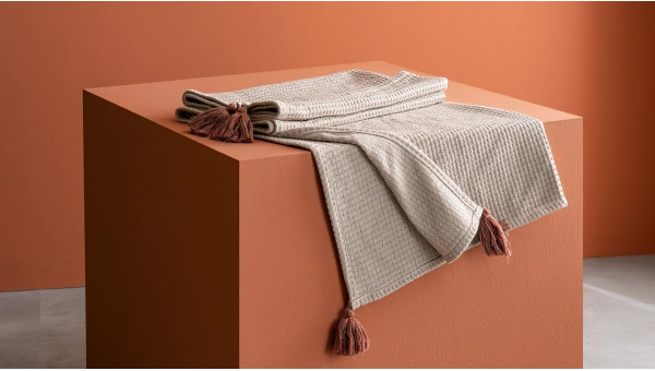 Cream Tasseled Pique Sofa Shawl