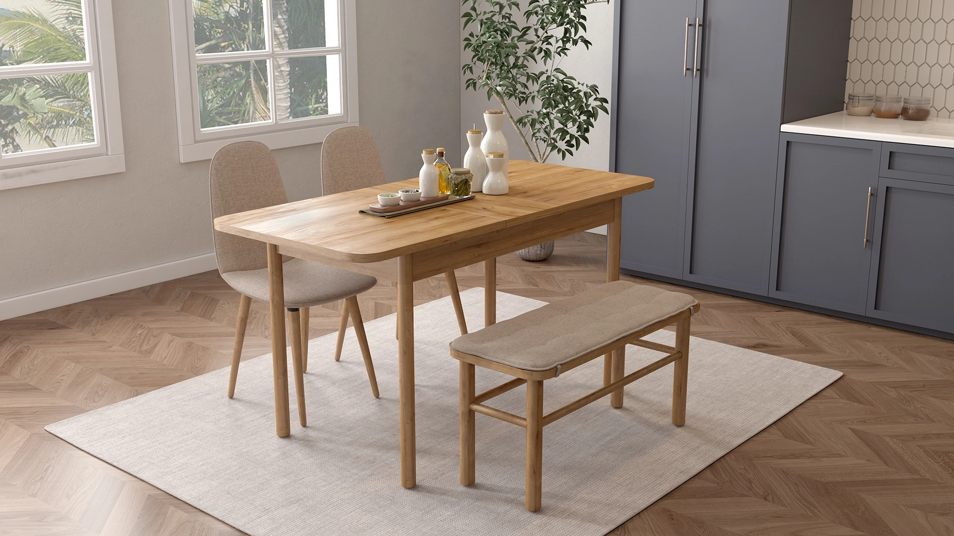Ades mutfak masası, açılır mekanizması sayesinde ekstra oturum alanı sunarak kalabalık sofralar için ideal bir seçenek oluşturuyor. Safir meşe rengi, masif ayaklarıyla birleşerek hem şıklık hem de dayanıklılık sağlıyor.