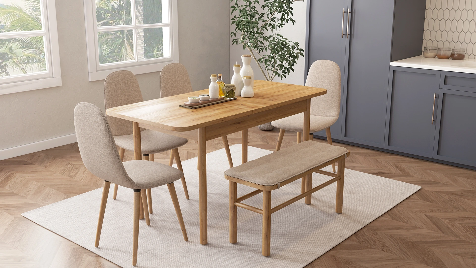 Ades bench, geniş oturum alanı ve masif ayaklarıyla sağlam ve estetik bir alternatif sunuyor. Kalabalık sofralar için ideal olan tasarımı, hem Ades hem de farklı mutfak masalarıyla kombinlenebilir. Ekstra minder eklenerek konfor arttırılabilir.