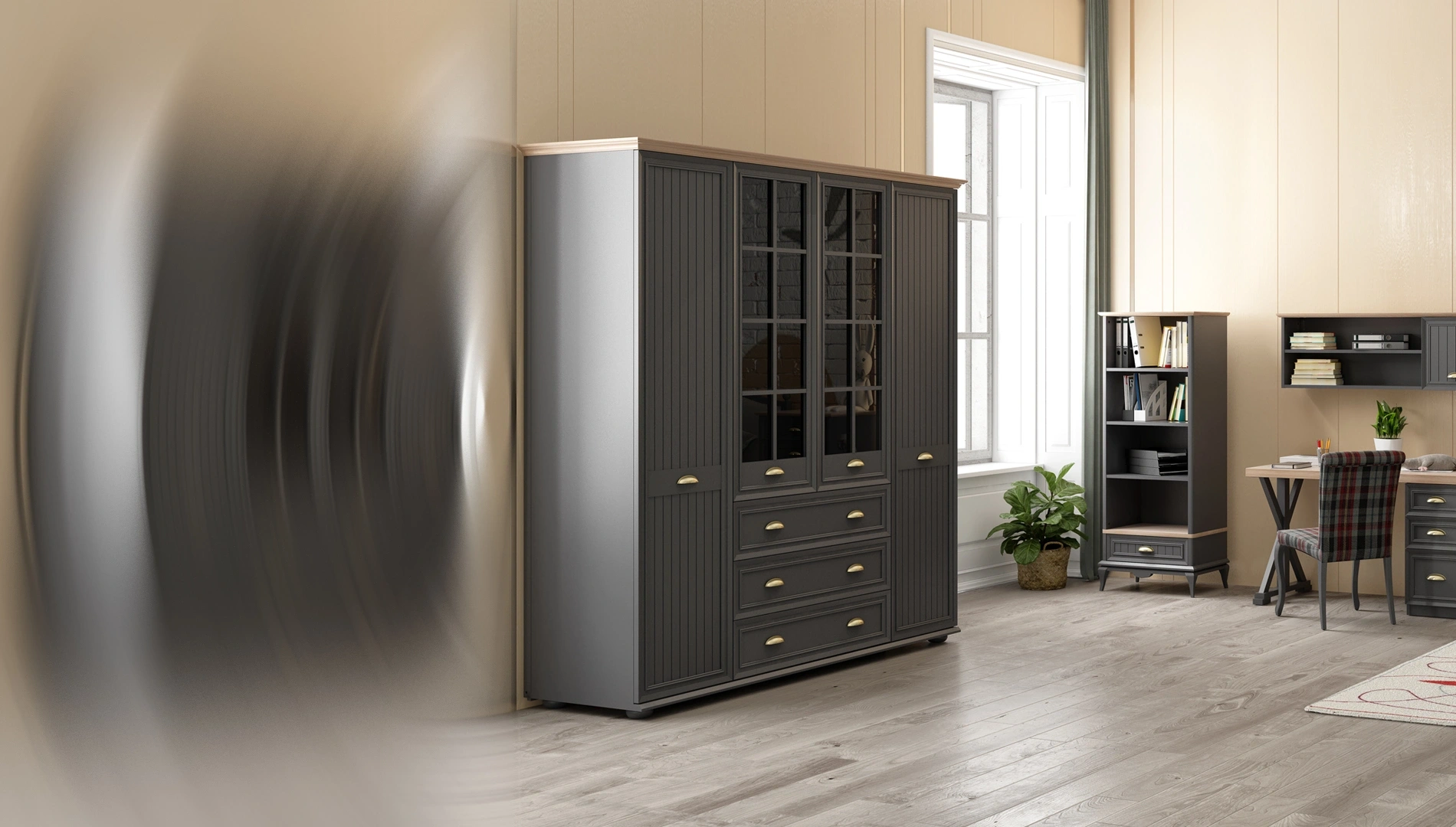 Angelic Dark 4 Door Wardrobe (200 cm) stands out with its modern design and golden handle detail and offers a unique and stylish design with its glass door unit at the top of its drawers.