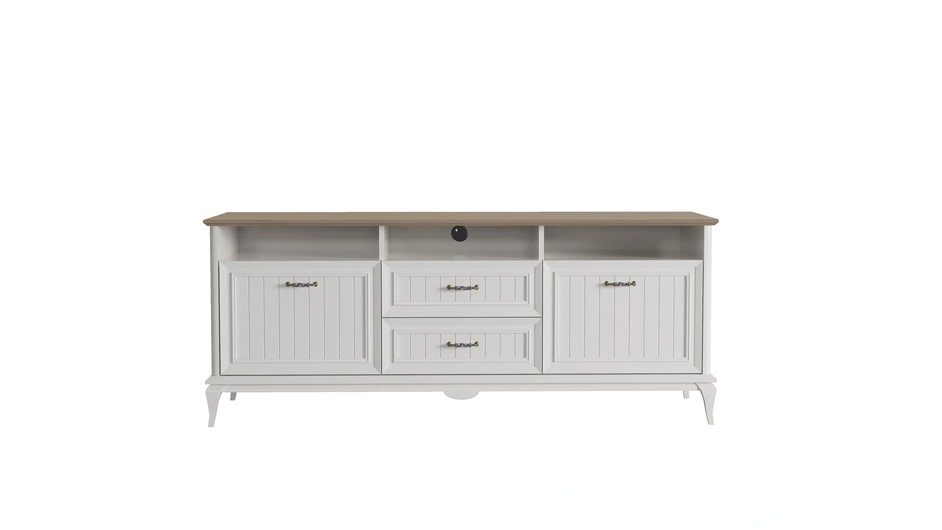 Angelic Tv Ünitesi, country stilinin nostaljik ve zarif çizgilerini evinize taşıyor. Orma beyaz ve Arizona meşe renk kombinasyonu, salonunuza sıcak ve davetkar bir hava katarken, geniş çekmeceli ve raflı bölmeleri sayesinde eşyalarınızı düzenli bir şekilde saklayabilirsiniz. Porselen kulpları, estetik detaylarla zenginleştirilmiştir. Angelic Tv Ünitesi, hem fonksiyonel hem de dekoratif özellikleri ile salonunuzun vazgeçilmez bir parçası olacaktır. Eşyalarınızı düzenli bir şekilde saklamak ve sergilemek için ideal bir çözümdür. Zarif ve şık tasarımı ile salonunuza estetik bir dokunuş katar. Kolay temizlenebilir yüzeyi ve dayanıklı yapısı ile uzun ömürlüdür. Geniş depolama alanları ile salonunuzdaki tüm eşyalarınızı rahatlıkla düzenleyebilir ve saklayabilirsiniz. Bu ünite, evinizin genel atmosferine uyum sağlayacak zarif ve işlevsel bir çözüm sunar.