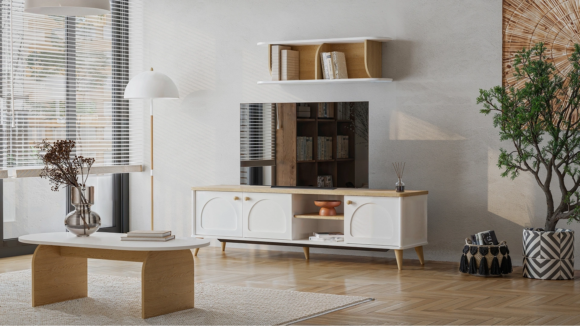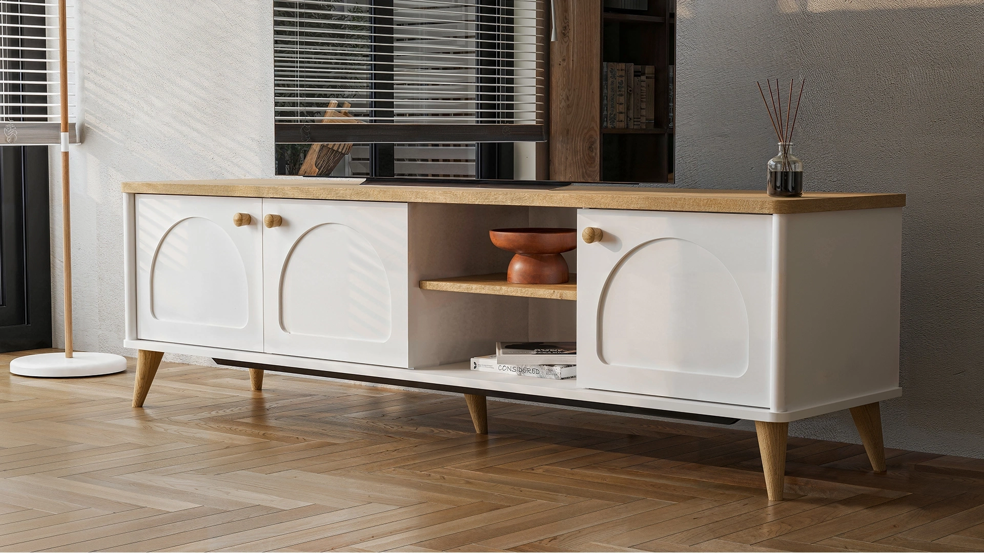 Üç kapaklı ve bir açık raflı yapısıyla fonksiyonel bir TV alanı sunar.