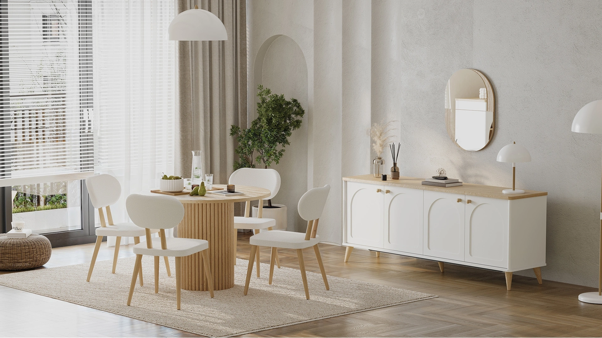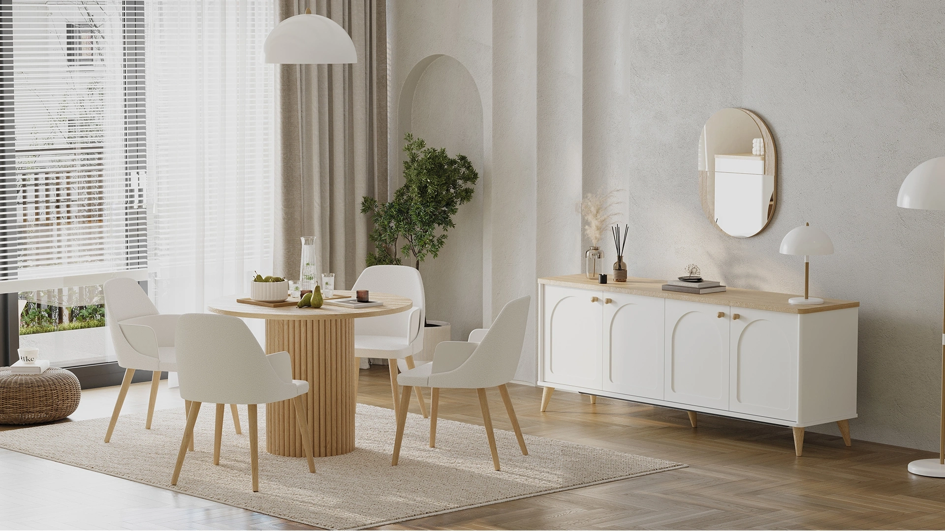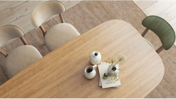 Sıcak ve samimi yemek alanları için ideal boyut ve formdadır. Özel çıtalı ayak tasarımıyla koleksiyonun öne çıkan parçalarındandır.