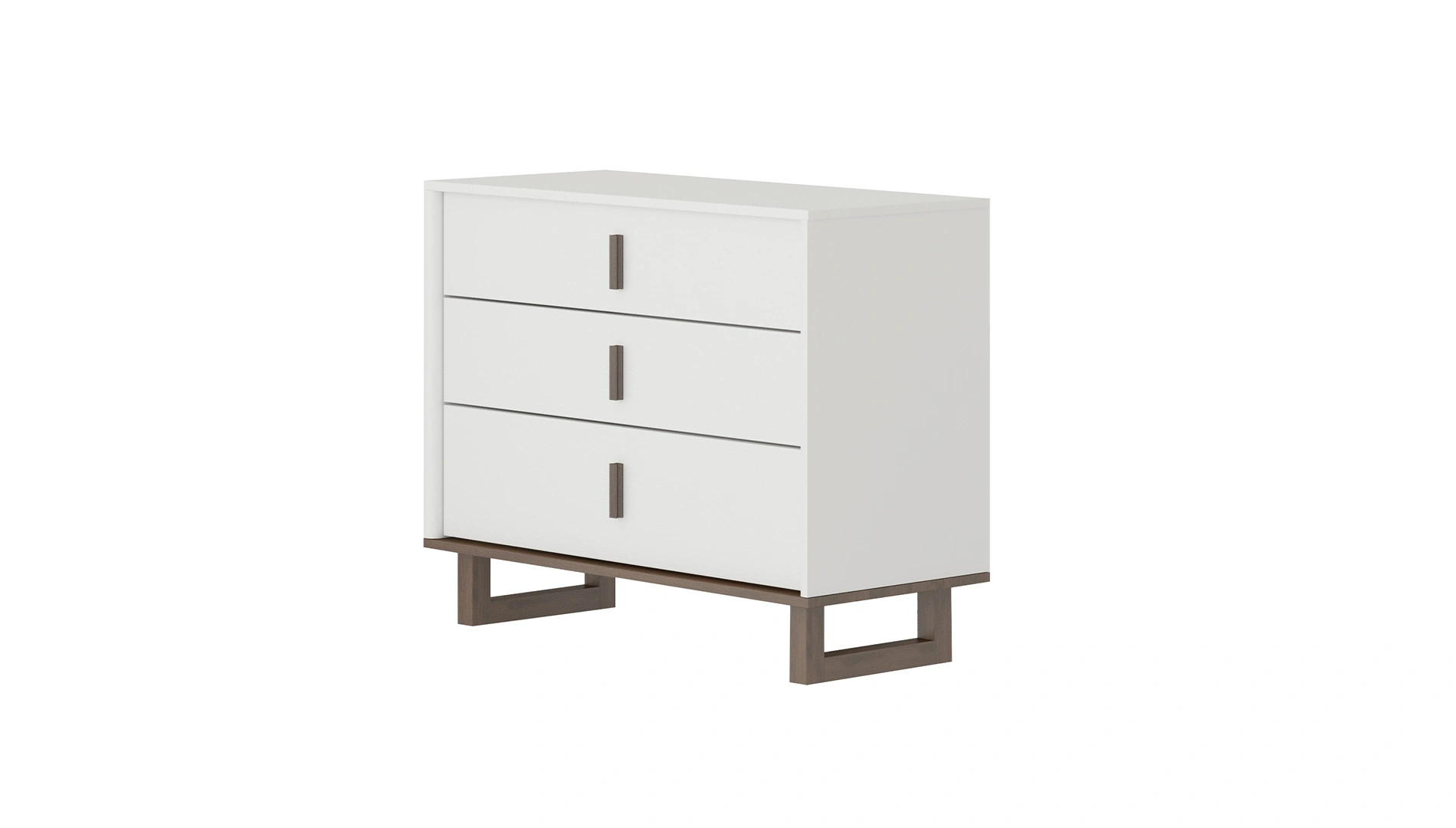 Calina Chest of Drawers attracts attention with its three-drawer and simple design. Creating extra space for your belongings, Calina Chest of Drawers offers the beautiful harmony of moonstone white and walnut finish and provides ease of cleaning with its high-leg design.