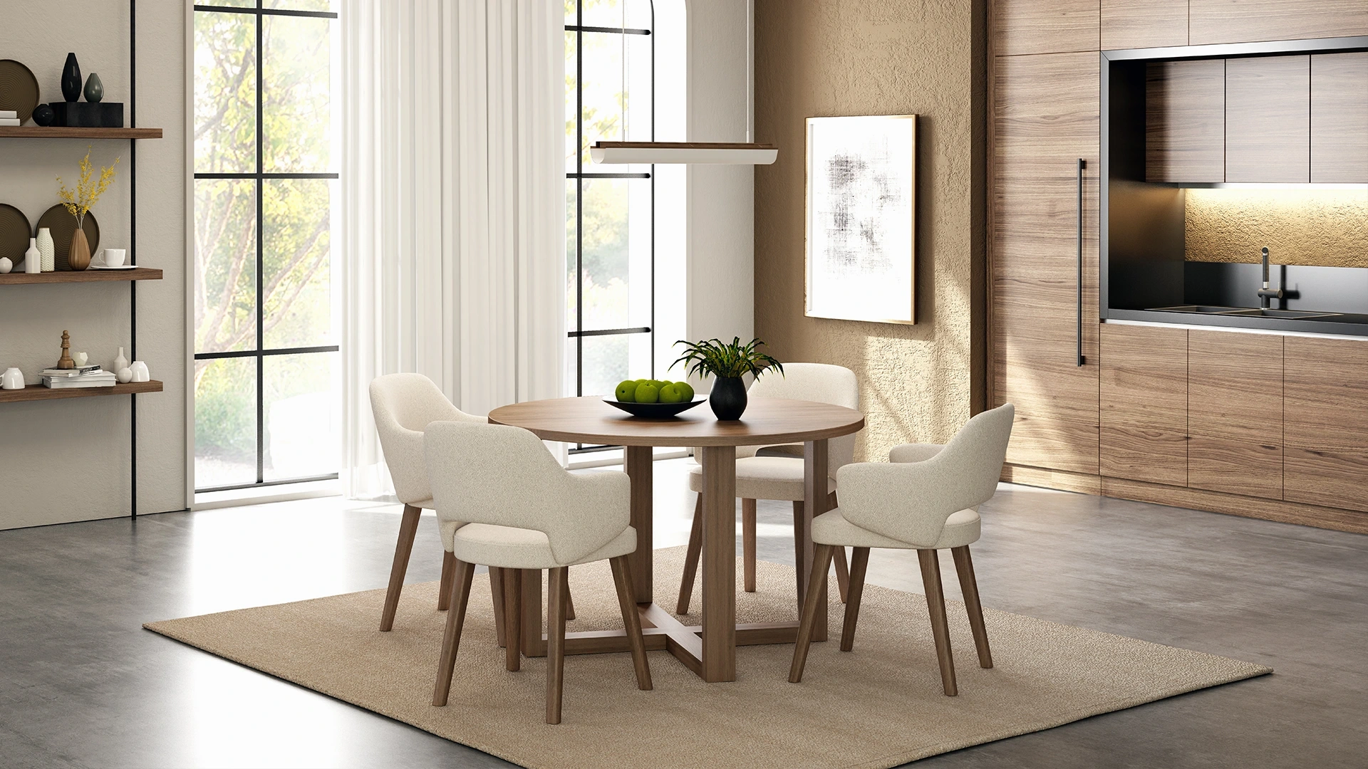 Combining the stunning harmony of Hitit walnut and moonstone white, the Calina Dining Room Set offers both elegance and comfort. With its ergonomic chairs, minimalist table design, asymmetrical sideboard, and round mirror, the Calina Dining Room Set is the perfect complement to the style of your home.