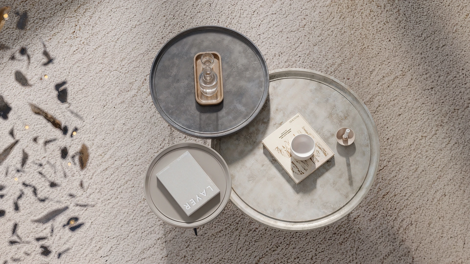 With its patterned gray surface and round shape, it harmonizes with modern living spaces.