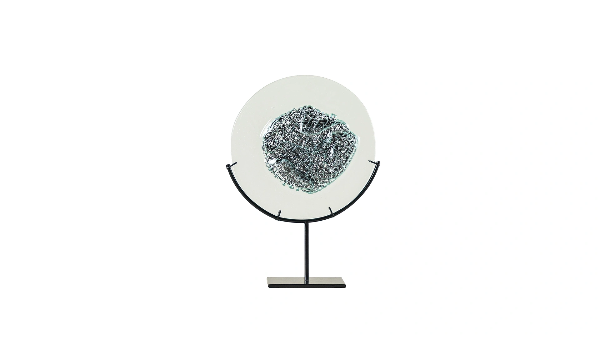 Glass accessory with metal wire detail inside, showcases a modern look with its black metal base.