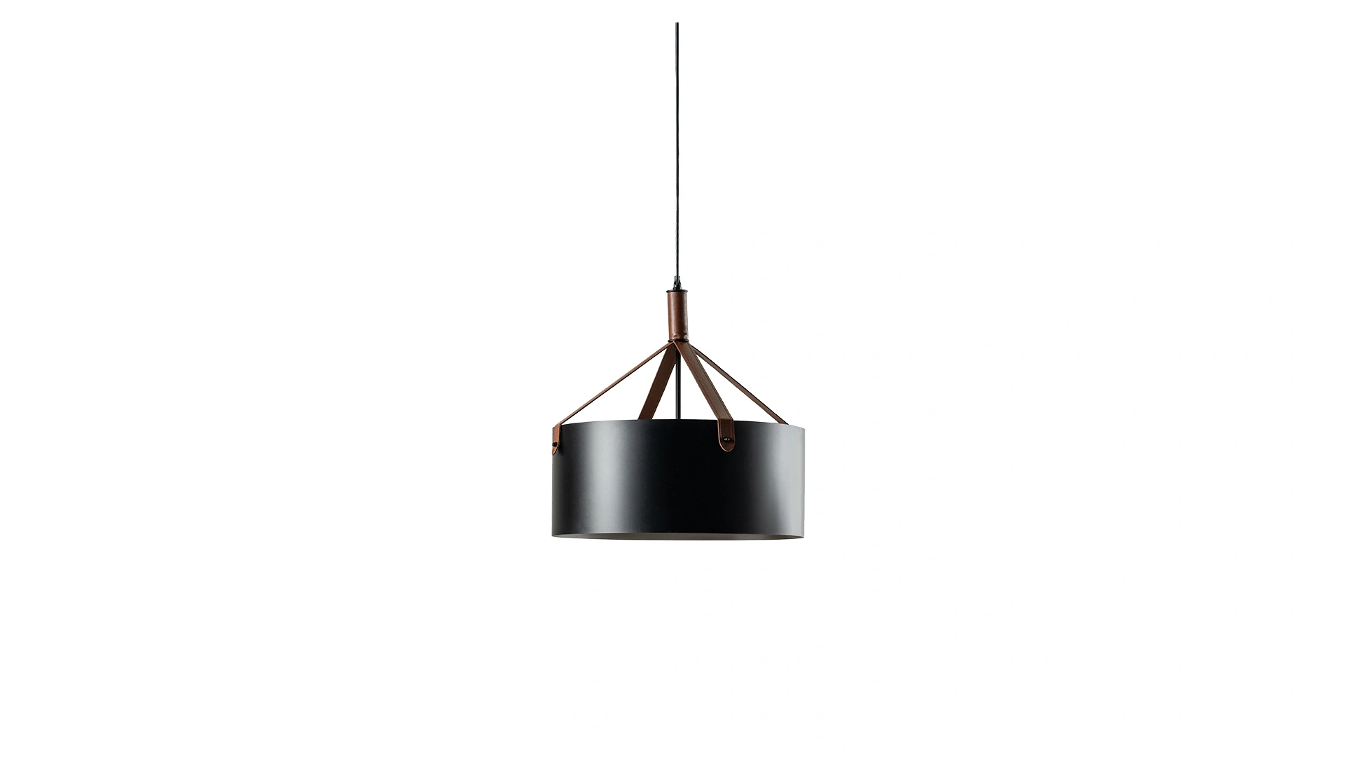 Deri detaylı metal gövdeli, siyah kumaş başlıklı şık TV tavan aydınlatması.