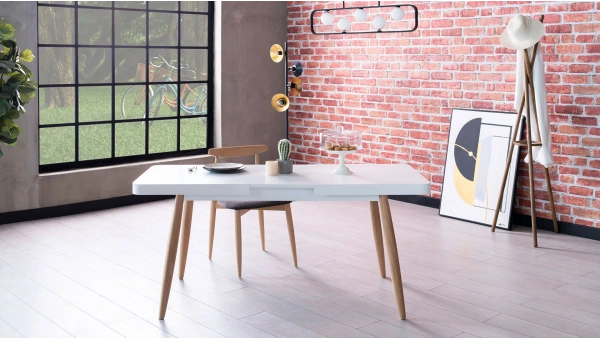 With a measurement of 120 cm, it extends to 180 cm by opening 30 cm from both sides, accommodating crowded gatherings. Its travertine textured top surface provides a natural and elegant look. The side-extending mechanism enhances functionality by providing ease of use in spaces.