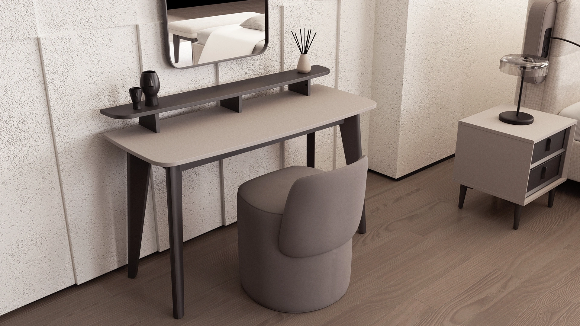 Maren makyaj masası, zarif detayları ve fonksiyonel yapısıyla kişisel bakım alanlarında konforlu bir kullanım sunar. Modern yatak odaları için şık bir tamamlayıcıdır.