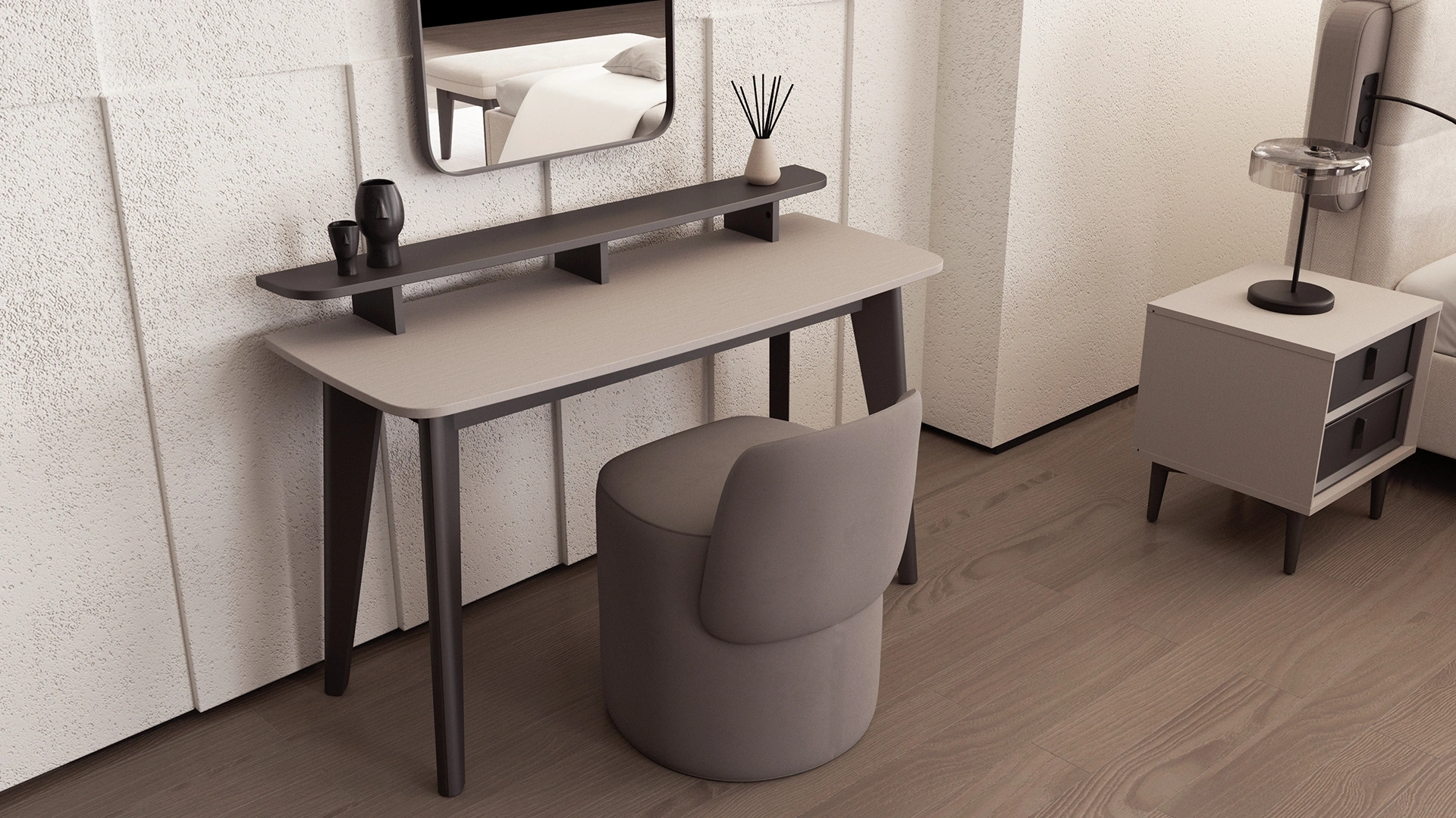 Makyaj masasıyla uyumlu, konforlu puf oturum alanı sunar.