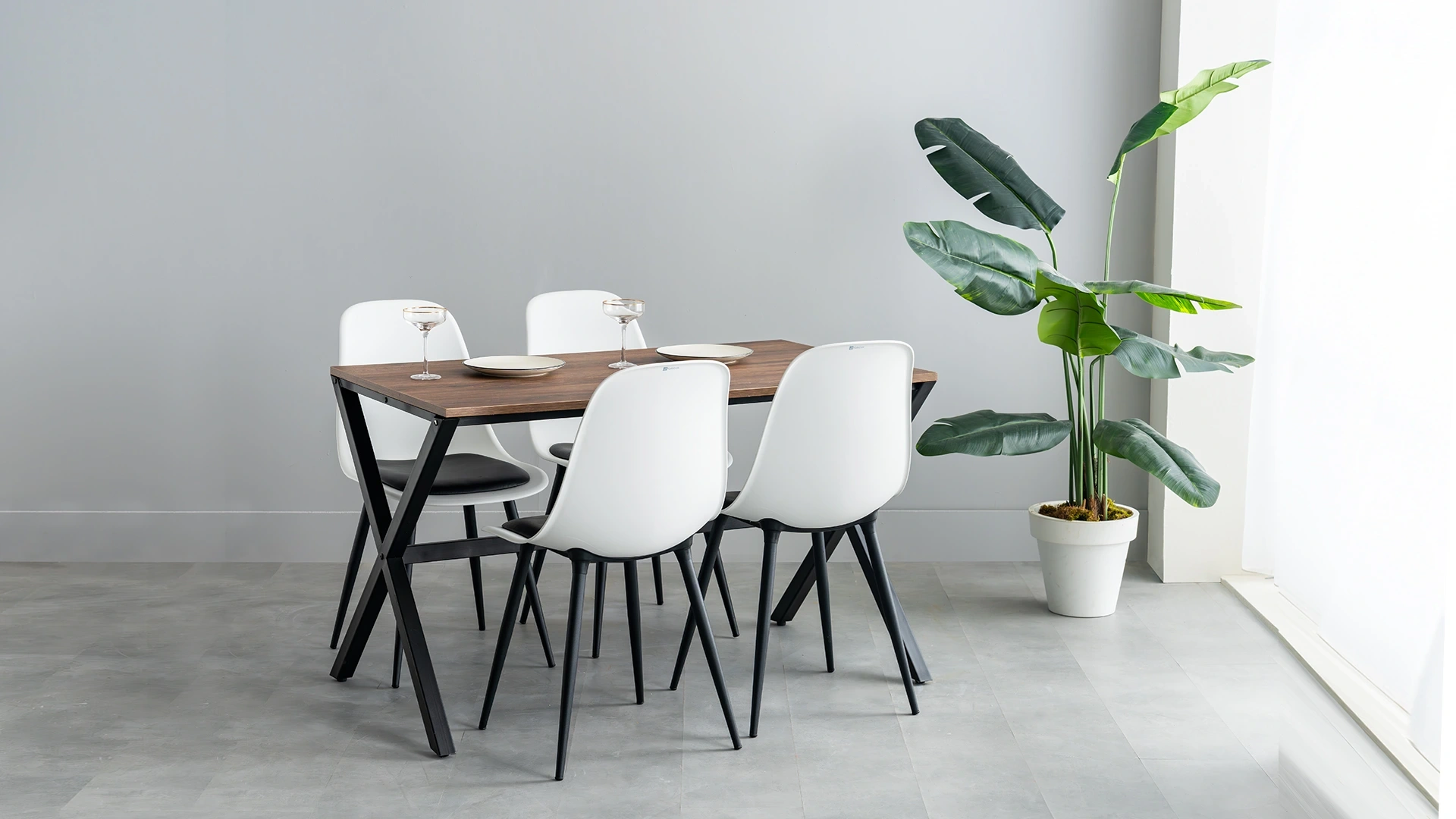 Marla Table, with its elegant X-shaped metal legs and natural wood surface, brings a strong touch to modern living spaces by combining durability and elegance.