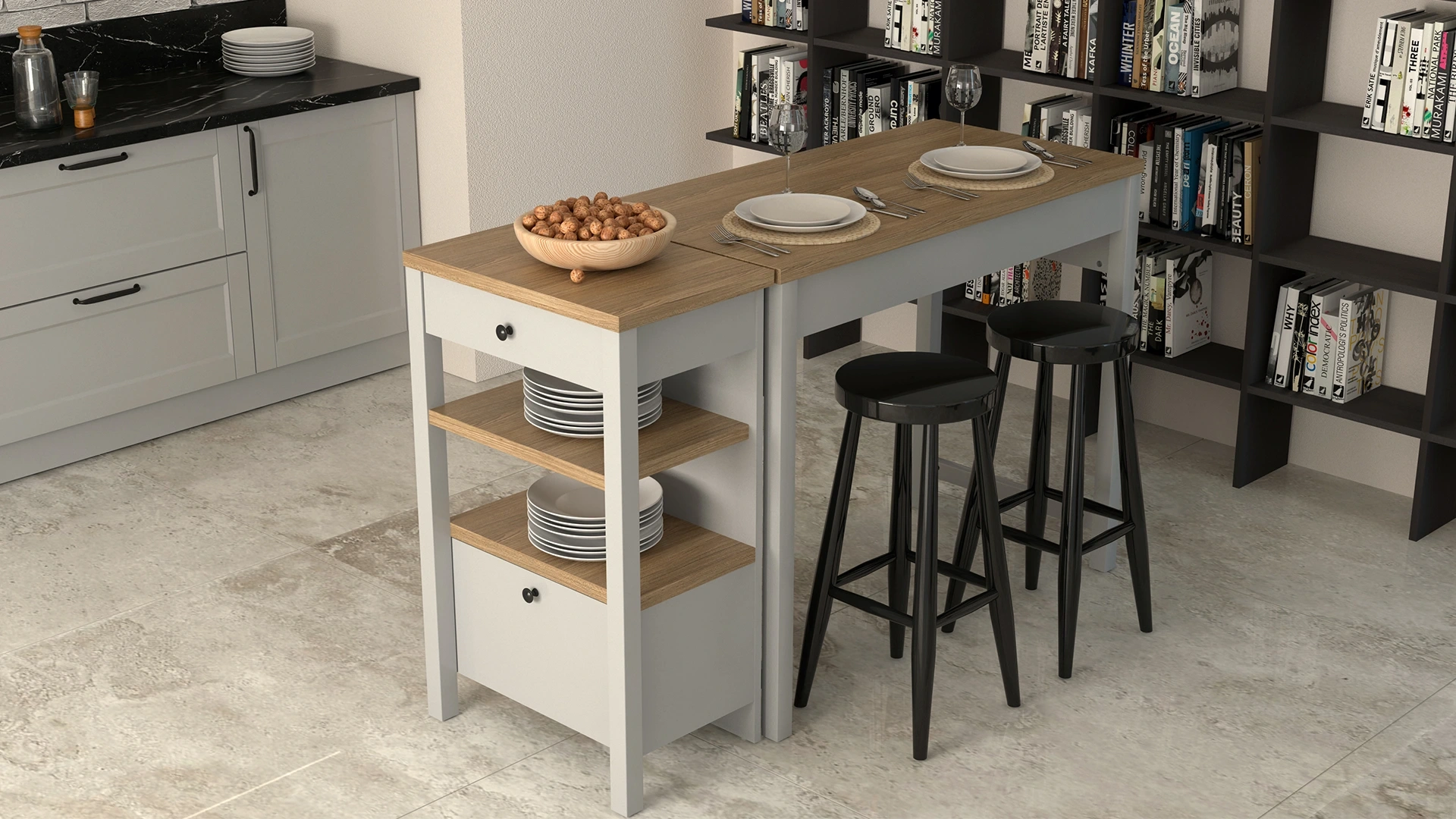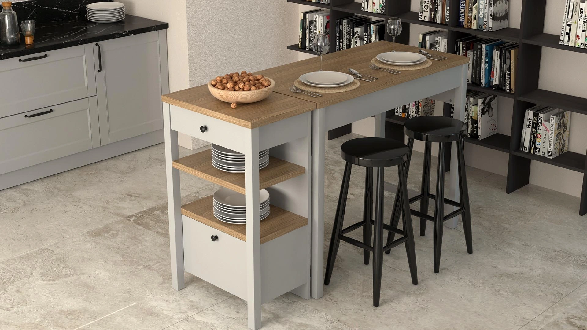 Martha Bar Masası Takımı, modern ve zarif tasarımı ile mutfağınıza şıklık katarken, dayanıklı malzemeleri ile uzun ömürlü kullanım sağlar. Bar yüksekliğindeki masa, küçük alanlarda bile büyük konfor sunar. Ergonomik oturma alanları ve sandalyeler, uzun süreli oturumlarda bile rahatlık sağlar. Minimalist tasarımı ile her türlü mutfak dekorasyonuna uyum sağlar. Kolay temizlenebilir yüzeyi ile bakım gerektirmez. Martha Bar Masası Takımı, fonksiyonel ve estetik özellikleri ile mutfağınıza değer katar. Zarif detayları ve modern çizgileri ile dikkat çeker. Bu takım, hem günlük kullanım için pratik bir çözüm hem de misafirlerinizi ağırlamak için şık bir alan sağlar. Uzun süreli kullanım için dayanıklı malzemelerden üretilmiştir. Ergonomik sandalyeleri ve bar yüksekliğindeki masa ile modern mutfaklar için ideal bir seçimdir.
