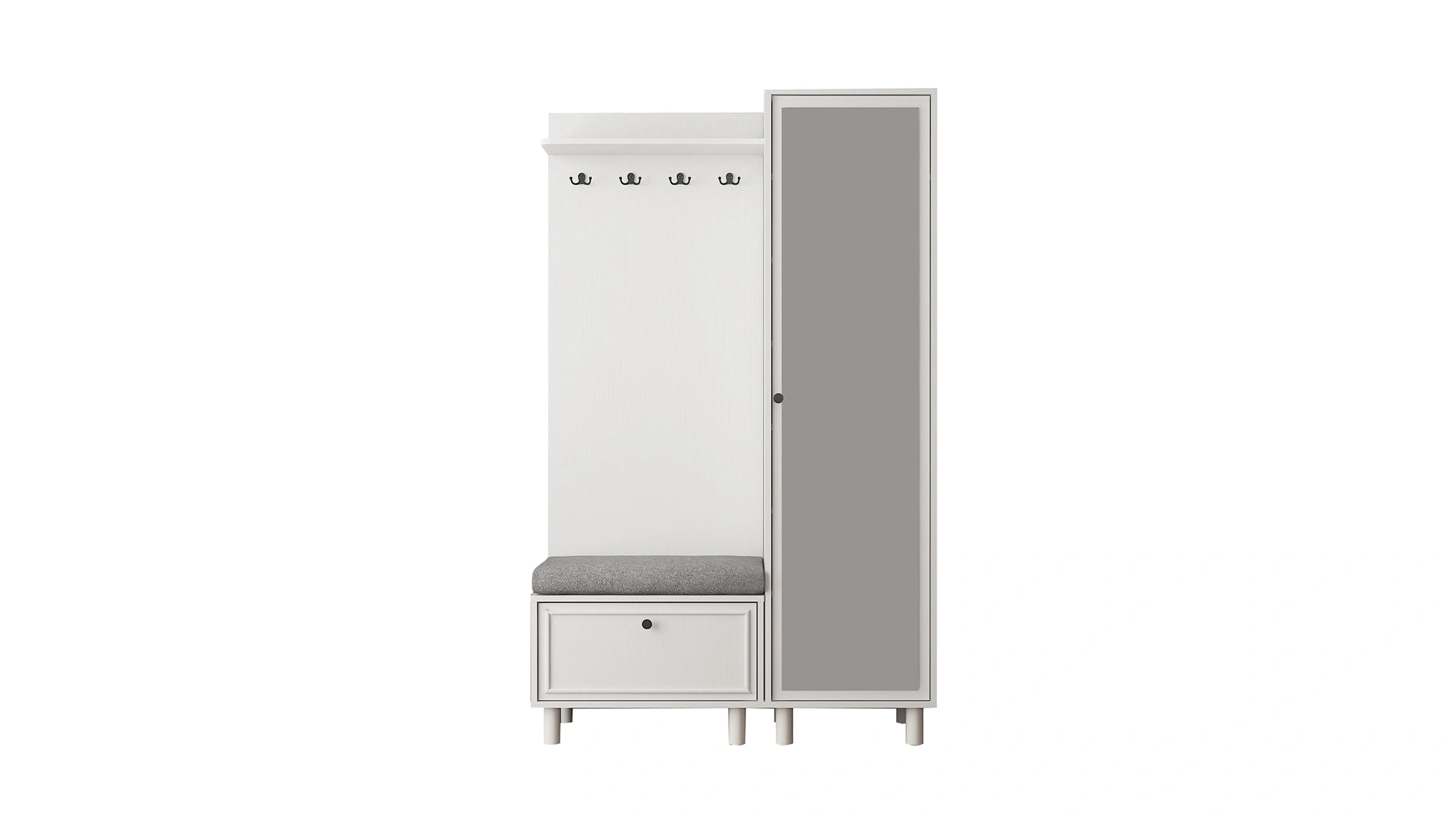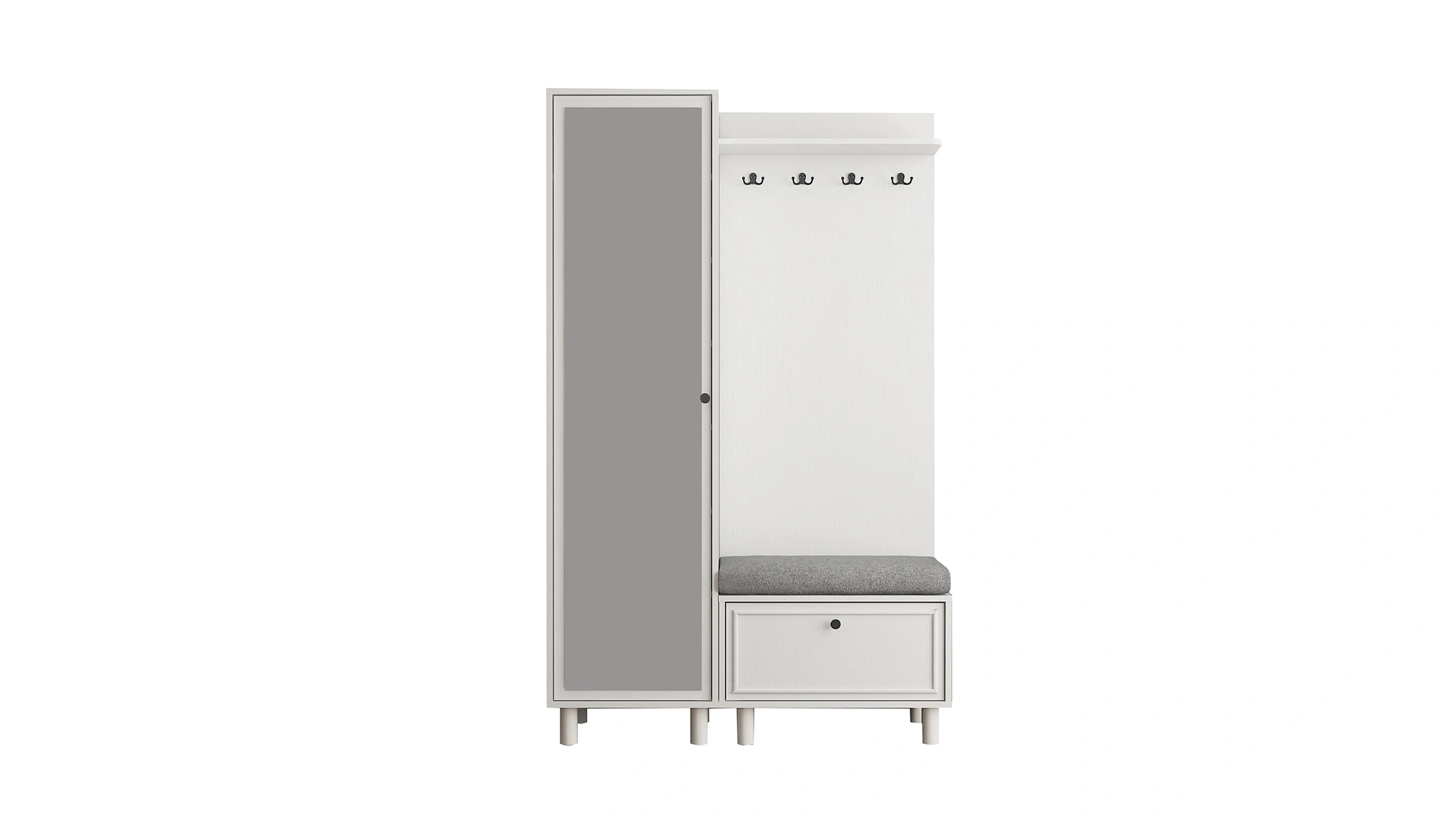 Noira portmanto, giriş alanlarında düzeni sağlarken şık detaylarıyla göz alıcı bir atmosfer oluşturur. Askılık, raf ve dolap bölmeleriyle kullanışlı bir saklama alanı sunar. Hareketli oturma minderi sayesinde konfor sağlar.