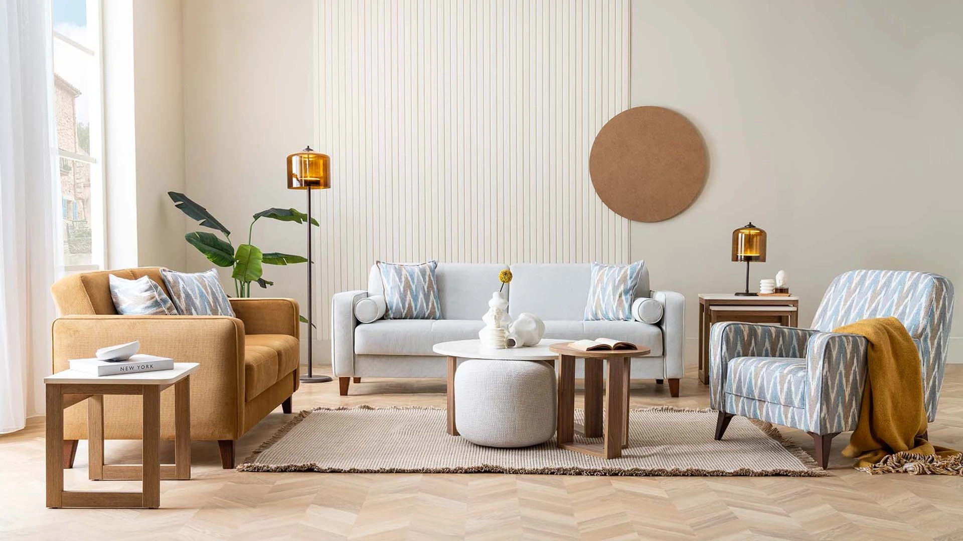 Noira Koltuk Takımı, retro tarzından ilham alınarak tasarlanmış zarif çizgileri, rahat yapısı ve uygun fiyatıyla dikkat çekiyor. Zamansız çizgileriyle göz kamaştıran Noira Koltuk Takımı, tekli, ikili ve üçlü koltuktan oluşuyor. Yumuşak tuşeli ve kendinden desenli kumaşları ekstra konfor ve estetik sunarken, etnik desenli kırlentlerle evlerde harika bir enerji yaratıyor. Üçlü ve ikili koltuklarda ters makas mekanizması ile yatak olabilme özelliği bulunurken, aynı zamanda sandık alanı da sunar. Metal çerçeve ile güçlendirilmiş ahşap iskelet ve 30DNS sünger kullanılarak üretilmiştir. Ceviz renk ABS ayaklar kullanılmıştır. Noira Koltuk Takımı, modern ve işlevsel oturma alanı arayan kullanıcılar için ideal bir tercihtir.