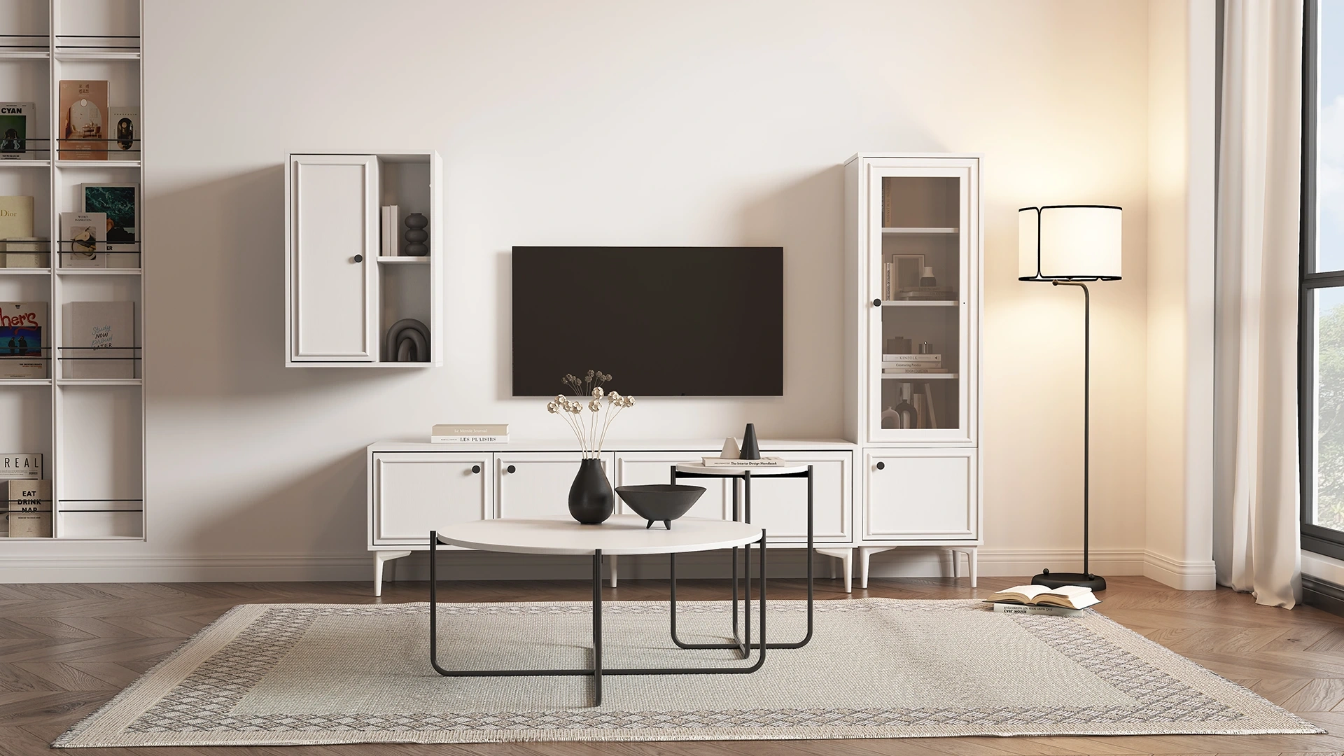 Tv ünitesini tamamlayan asma dolap, duvar kullanımını optimize eder. Minimalist tasarımı, koleksiyonun sade ve zarif stilini pekiştirir.