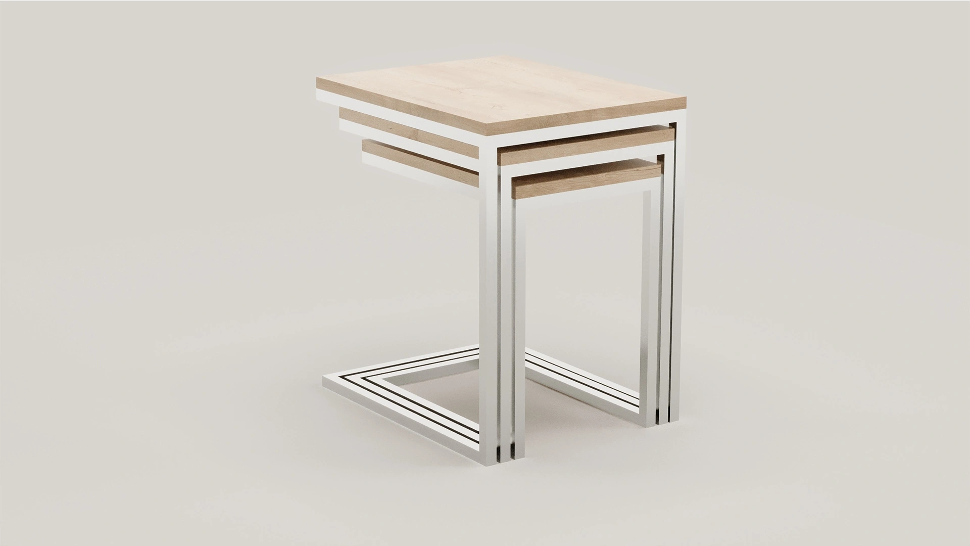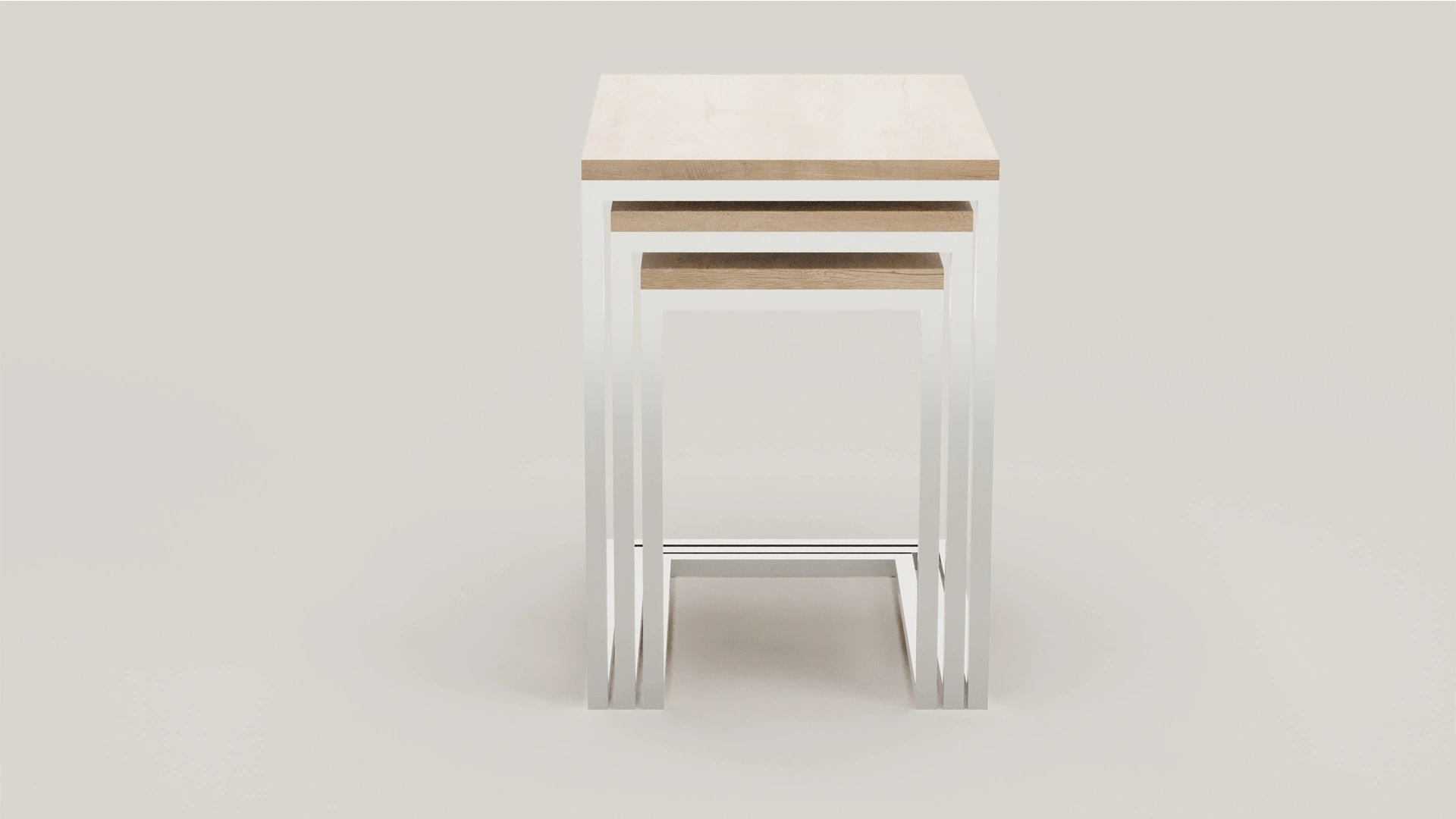Redoro Nesting Table brings practicality and elegance to your living space with its natural oak color, chrome legs, and minimalist design.