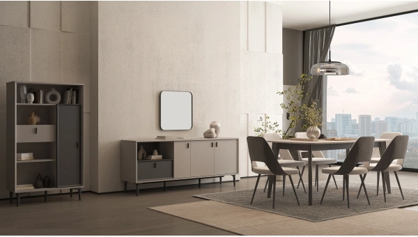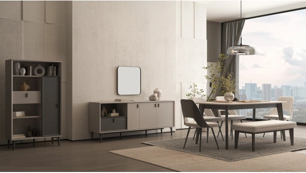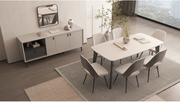 Zarif tasarımıyla dikkat çeken Senta Yemek Odası Takımı, ceviz ve oya keten dokunun şık kombinasyonu ile göz kamaştırıyor. Senta Yemek Odası Takımı ergonomik tasarımlı sandalyeleri, yalın çizgilere sahip masası, ekstra konfor sunan benchi, minimal konsolu ve dikdörtgen aynasıyla göz dolduruyor.