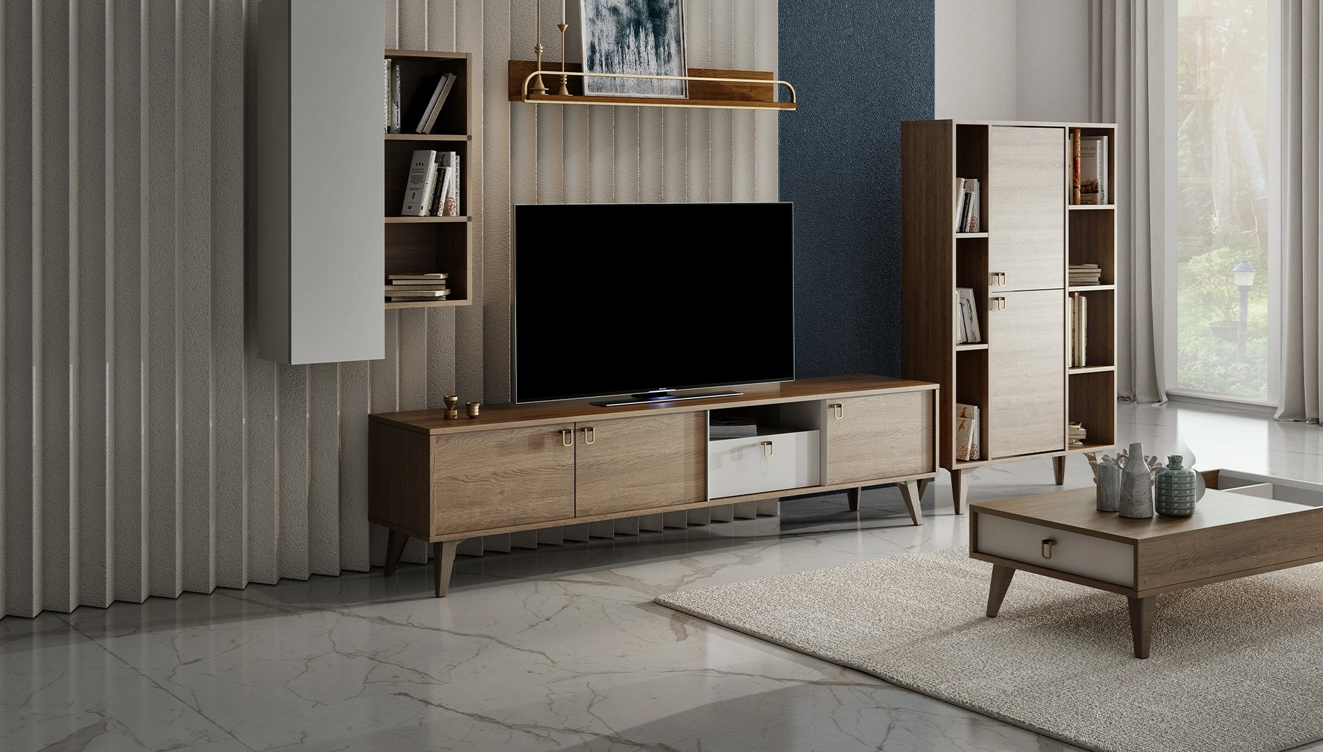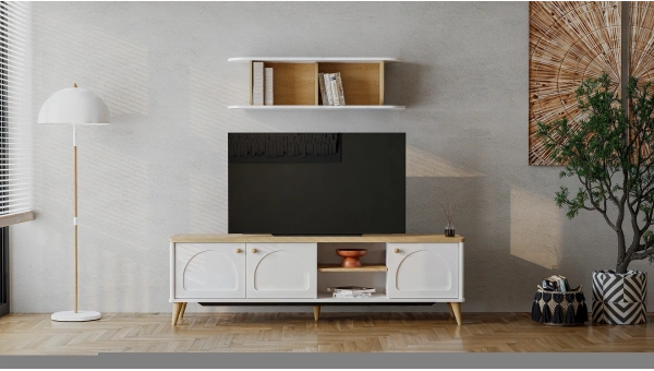 Offering the elegant combination of white and natural wood, Viena Tv Base Unit is ready to make a stylish touch in your living room. Standing out with its minimalist line and bronze handle accent, Viena Tv Base Unit provides a great space for your items and accessories.