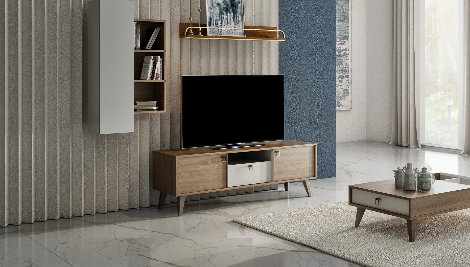 Viena TV Ünitesi, yalın tasarımı, gold ve deri detaylı kulplar ile dekoratif aynalarla zarif bir şekilde tamamlanarak seyir keyfinizi arttırıyor.