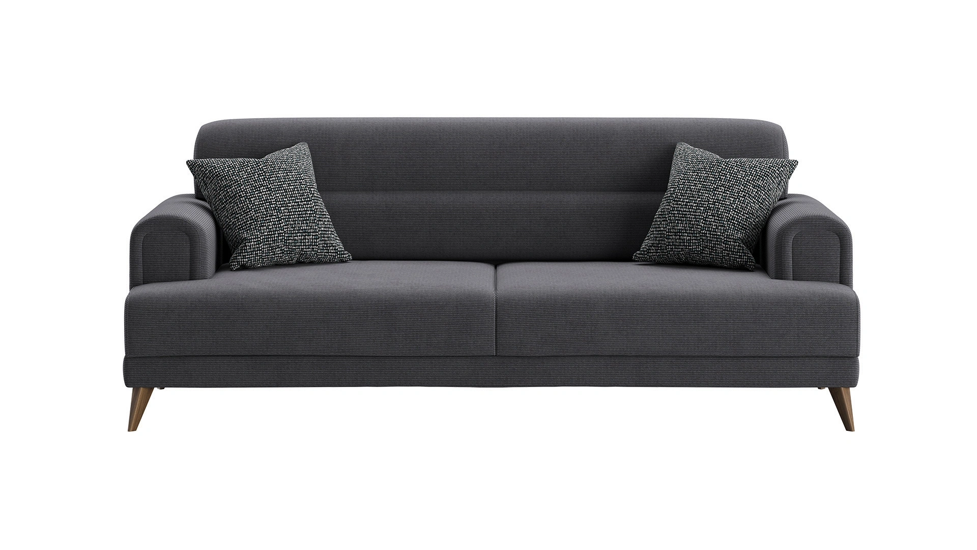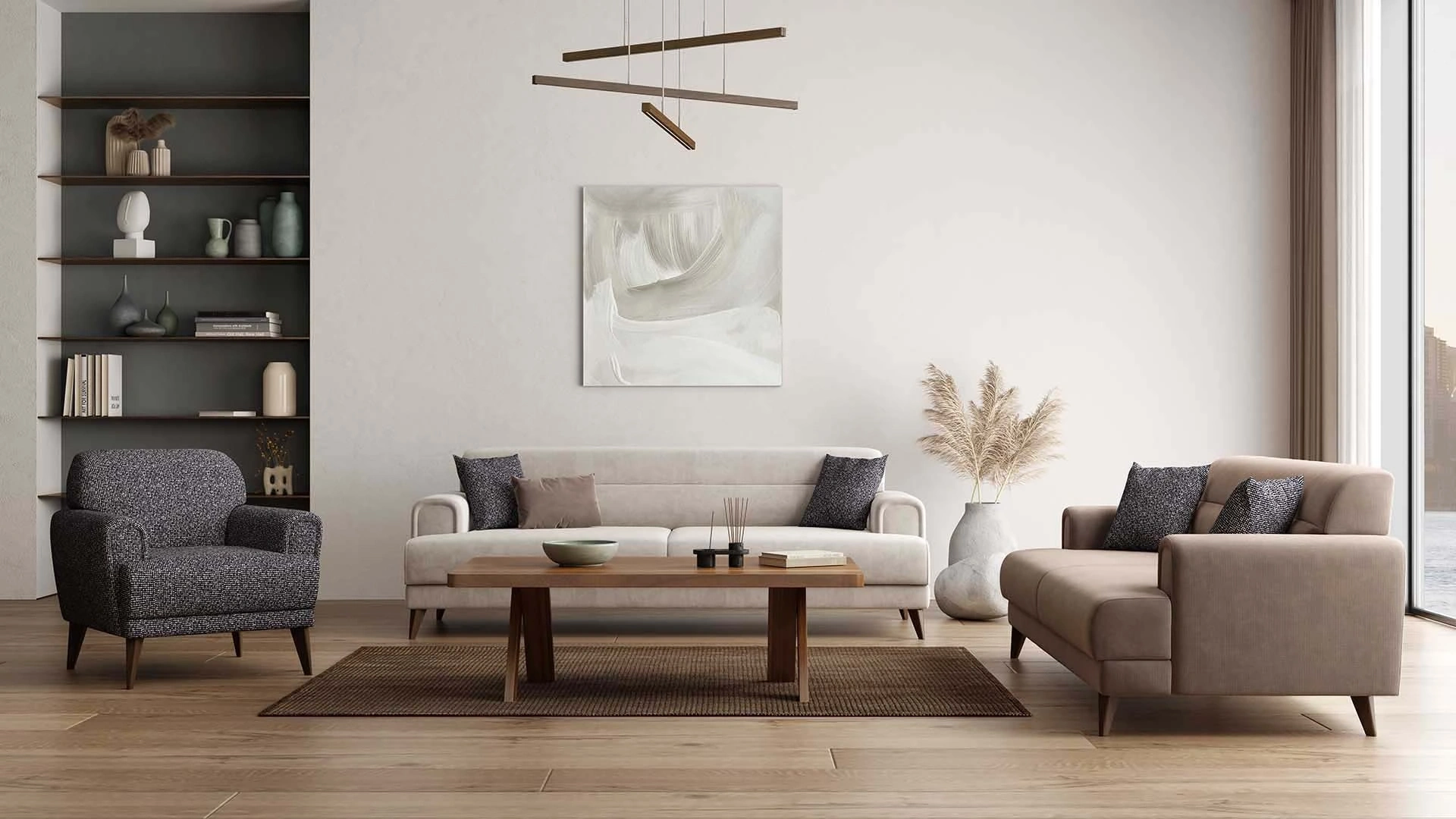 Eva Koltuk Takımı, modern tarzı, zarif çizgileri ve rahat yapısıyla dikkat çeker. Oval kol ve sırt yapısıyla tekli, ikili ve üçlü koltuktan oluşan bu takım, ekstra dolgulu ve özgün desenli kumaşlarıyla evlerde pozitif bir atmosfer oluşturur. Üçlü koltukta bulunan mekanizma sayesinde sırt kısmı geriye kayarak yatak olabilme özelliği sunar ve aynı zamanda içinde depolama alanı sağlar. Metal çerçeve ile güçlendirilmiş ahşap iskelet ve 30DNS sünger kullanılarak üretilen Eva, ceviz renk ABS ayaklarla tamamlanmıştır. Krem ve somon renkli kumaş kombinasyonlarının yanı sıra, berjerde kullanılan özel desenli kumaşla da farklılık sunar. Eva Koltuk Takımı, modern ve konforlu bir oturma alanı arayan kullanıcılar için ideal bir tercihtir.
