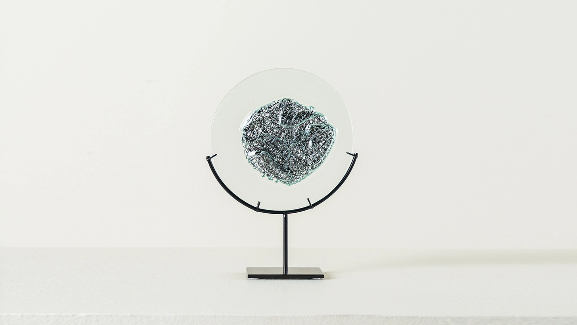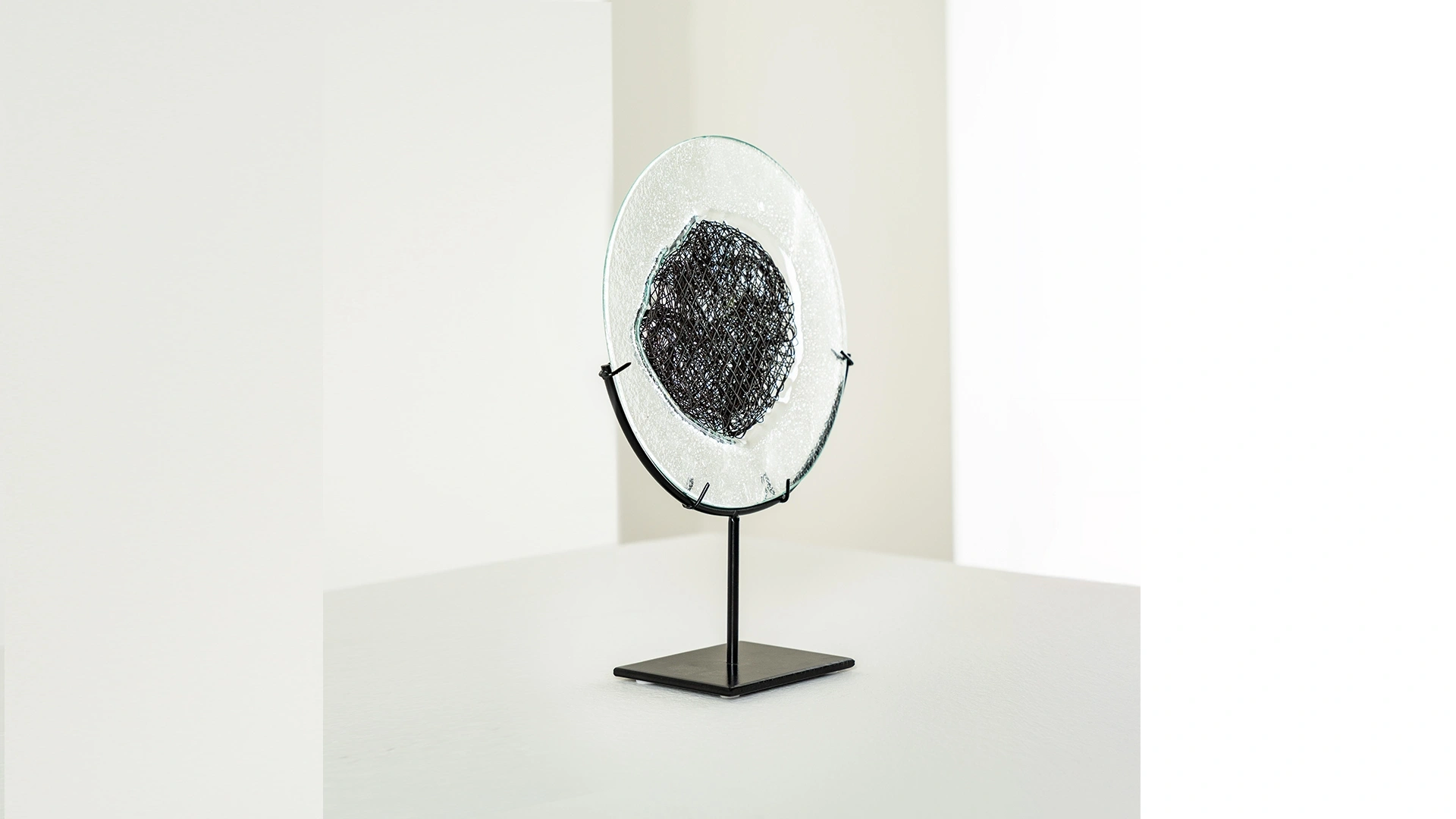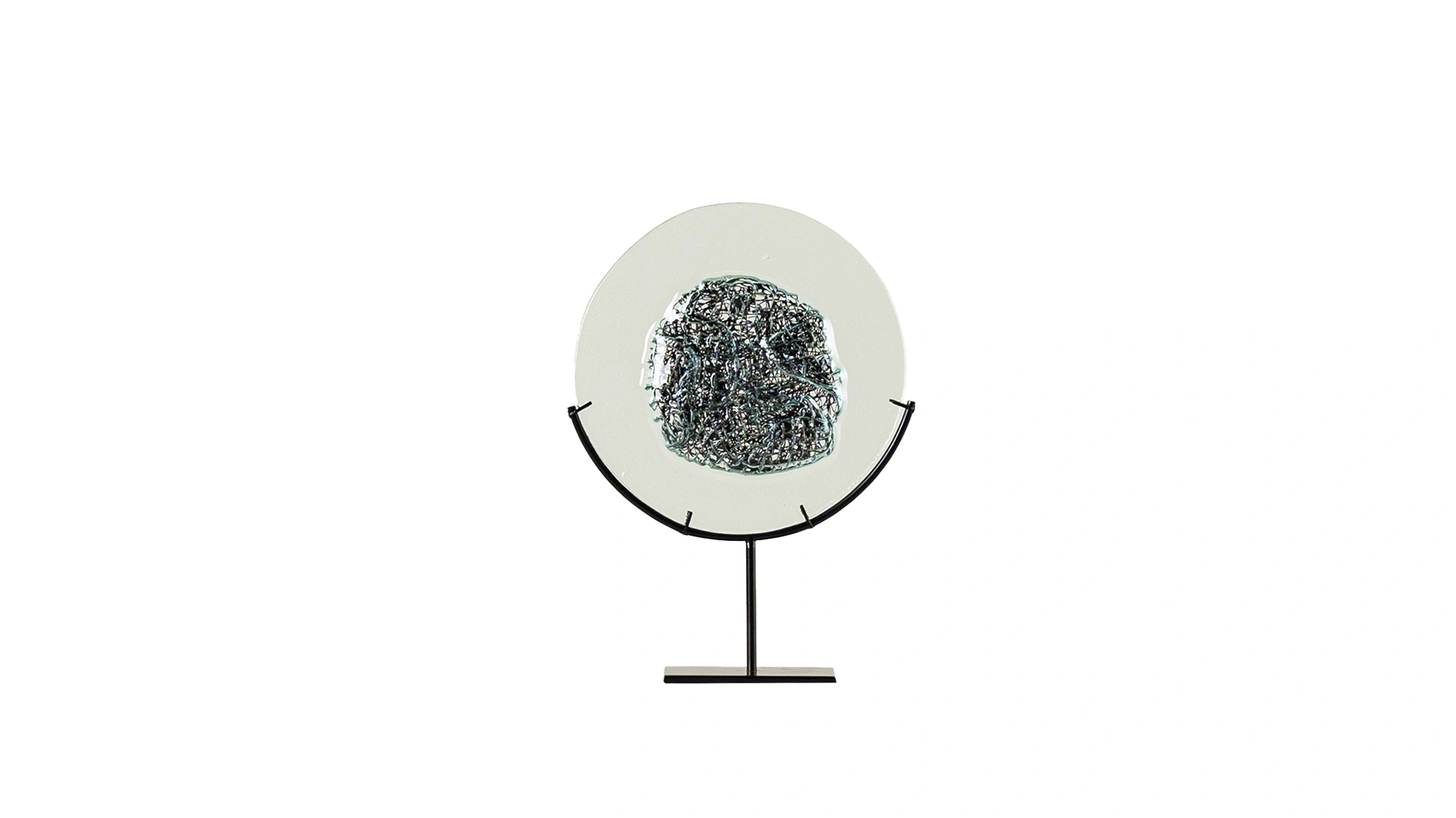 İçinde metal tel detay bulunan cam aksesuar, siyah metal ayağıyla modern bir duruş sergiler.