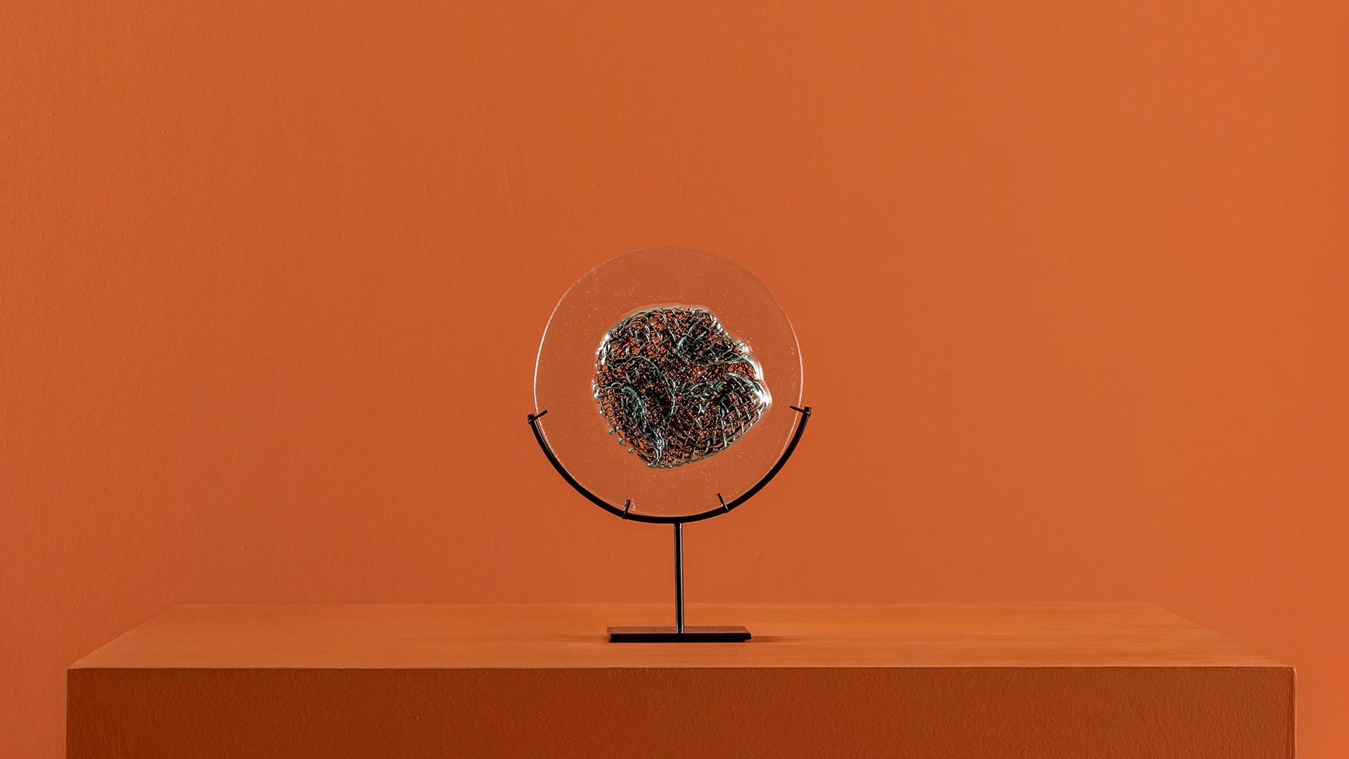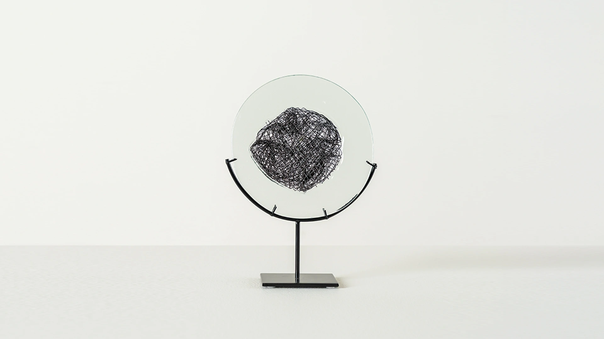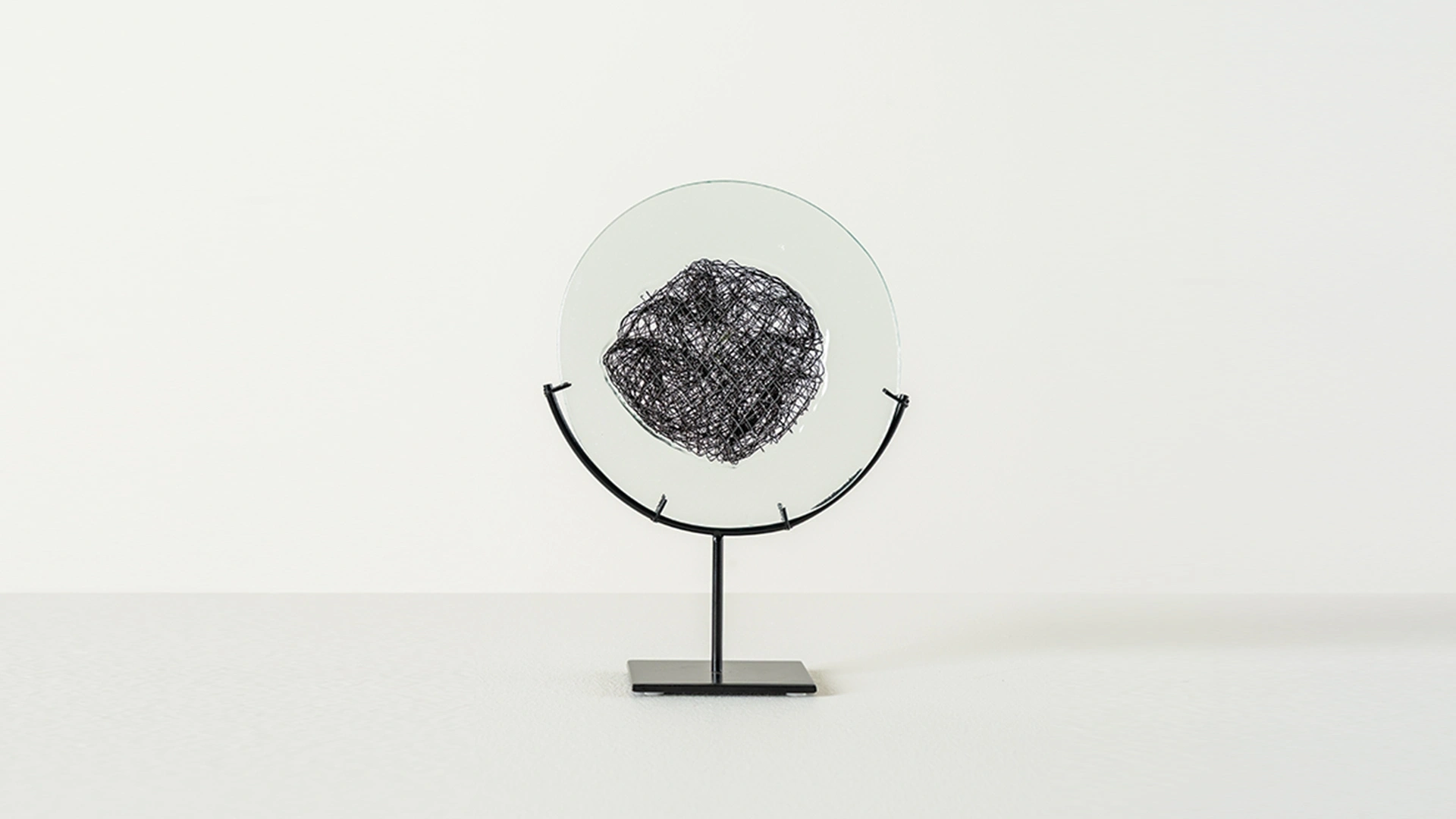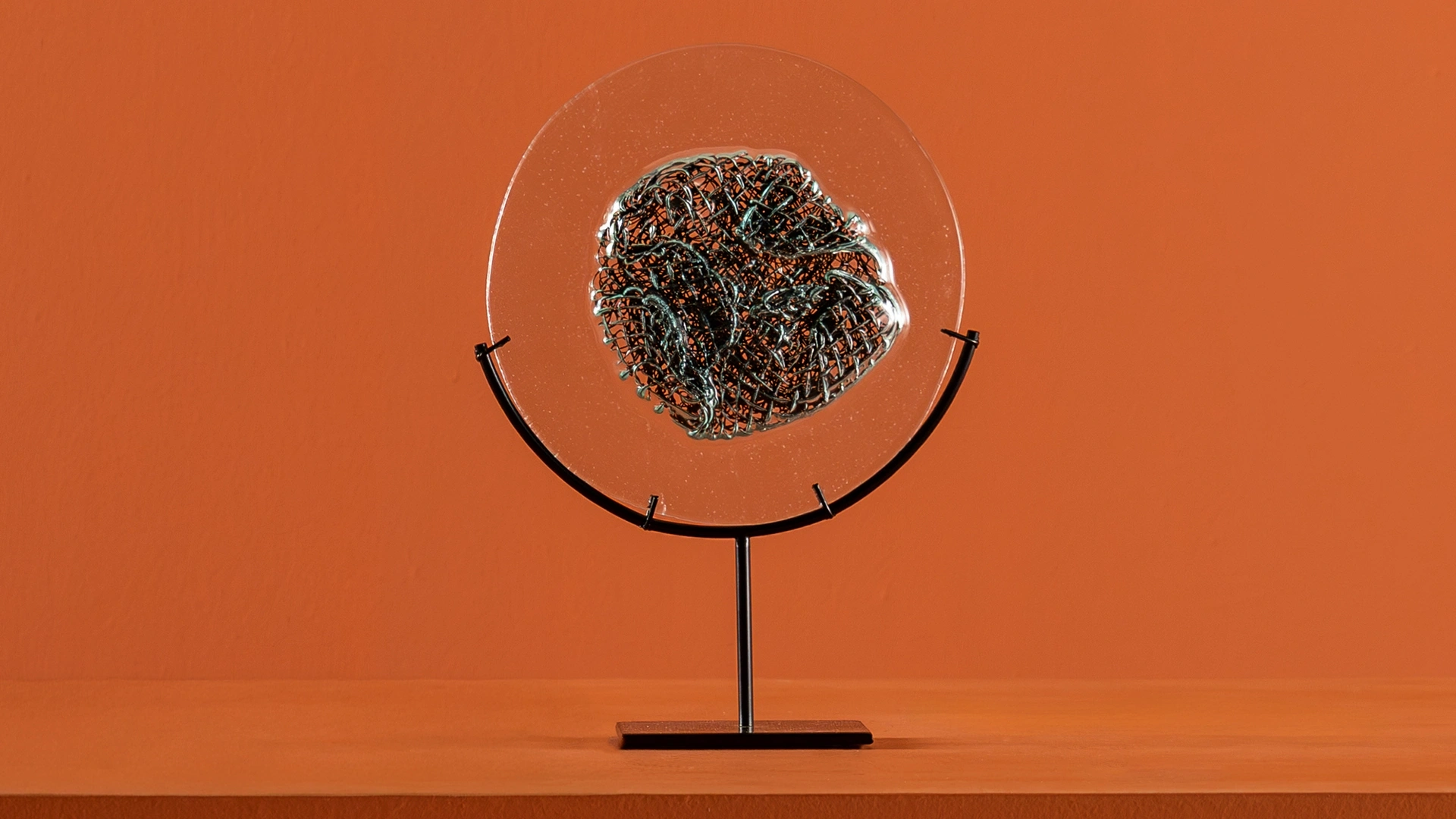 İçinde metal tel detay bulunan cam aksesuar, siyah metal ayağıyla modern bir duruş sergiler.