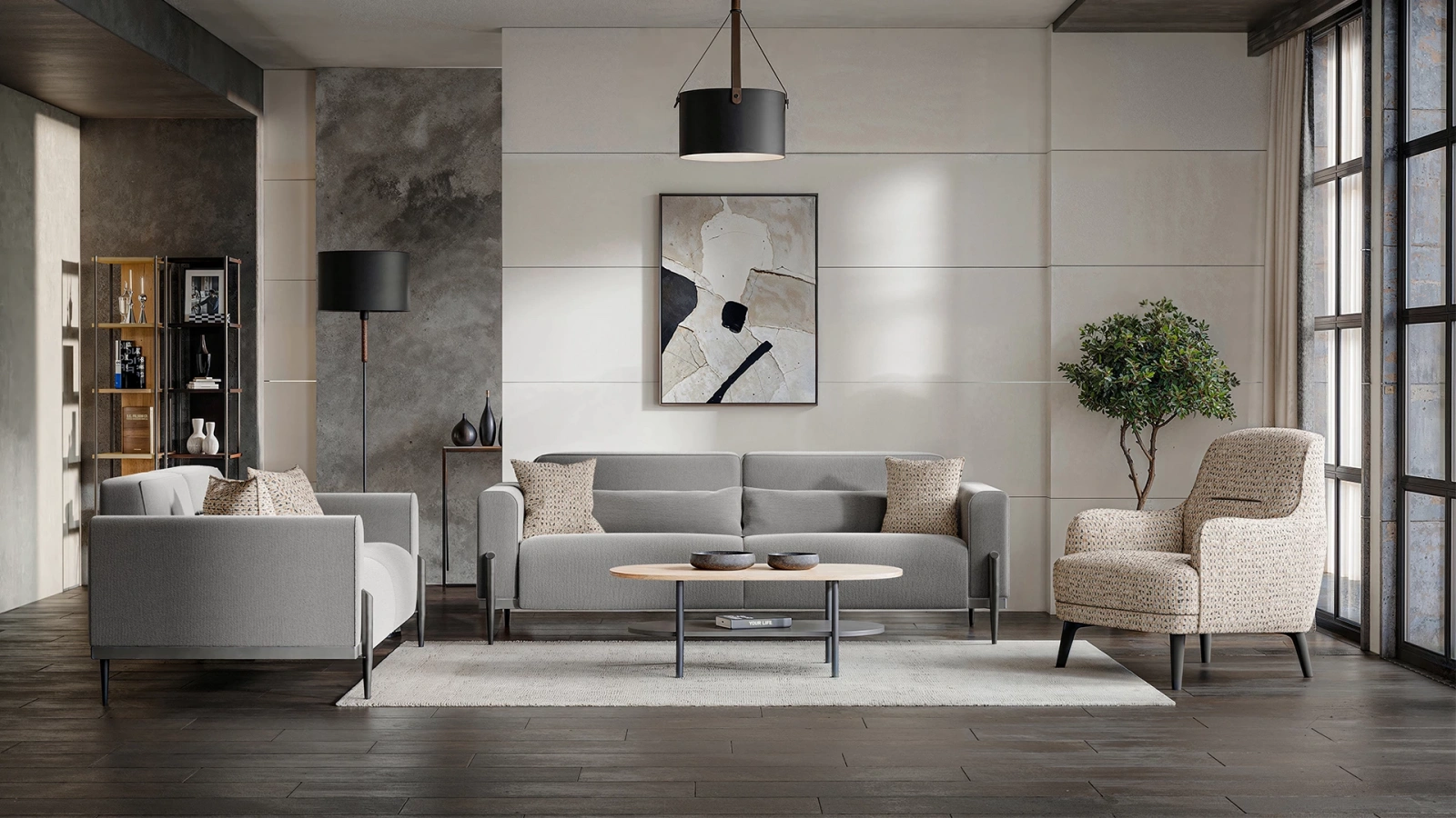 Endüstriyel modern tarzın yalınlığıyla zarif çizgilerin buluştuğu Grid koltuk takımı, yaşam alanlarına karakteristik bir duruş kazandırıyor. Siyah metal ayaklar, endüstriyel tarzın temelini oluşturarak koltuğa sağlam ve güçlü bir duruş katarken, nubuk detaylar sıcak ve samimi bir dokunuş sağlıyor. Bu denge, hem endüstriyel hem de modern stilin simgesi niteliğinde.