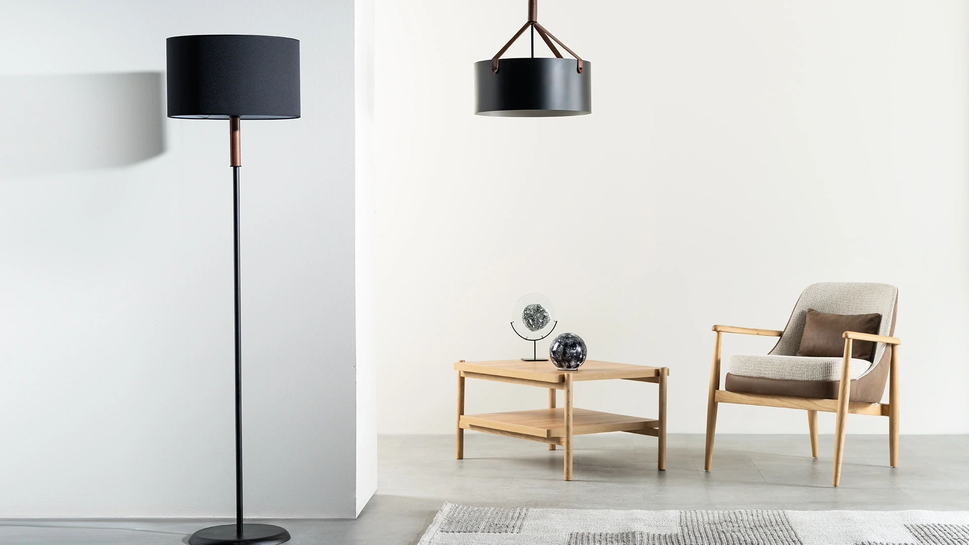 Deri detaylarla bütünleşen metal gövde ve siyah kumaş başlığıyla modern ve şık bir görünüm sunan lambader, yaşam alanlarınıza sıcak ve sofistike bir atmosfer katar.