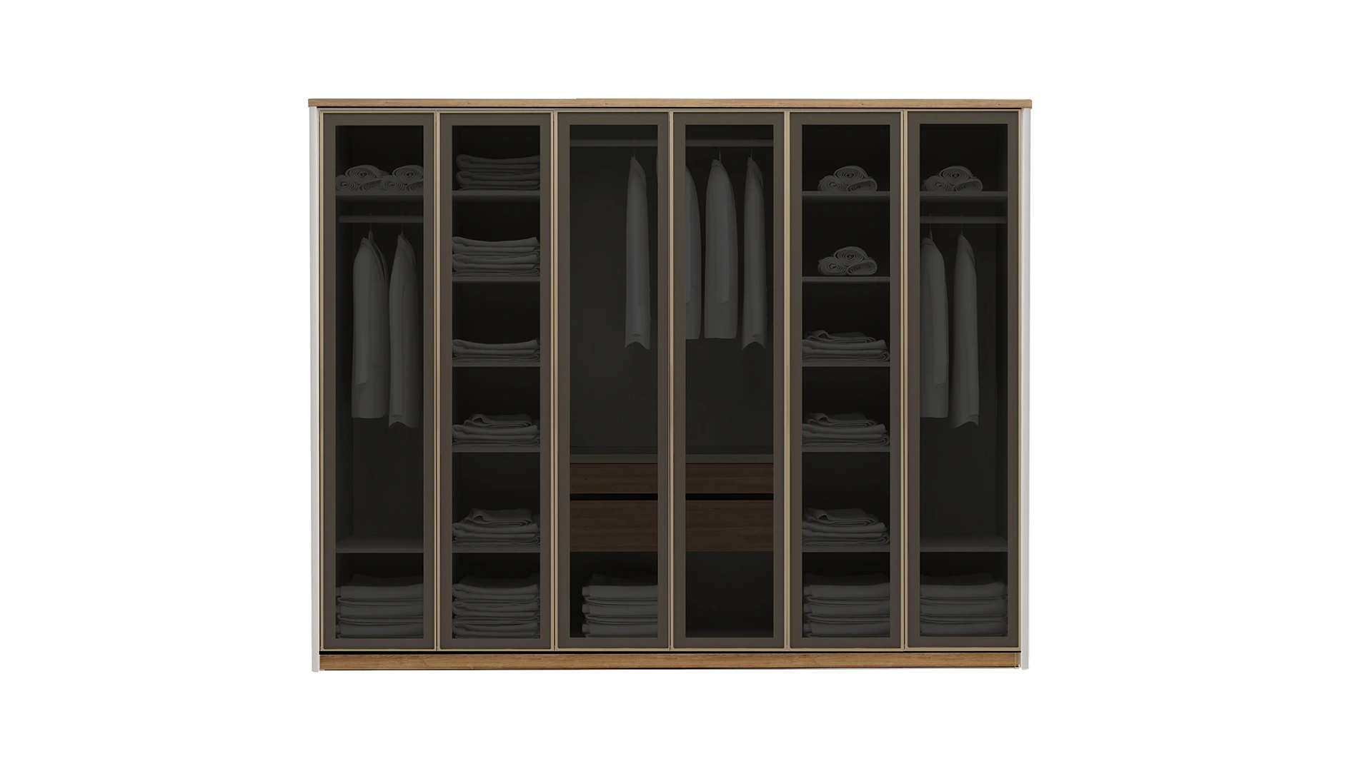Lionte dolap, cam, ayna ve membran kapak seçenekleriyle kişiselleştirilebilir. Ledli askı boruları ve mücevherlik çekmecesiyle fonksiyonellik sunar.
