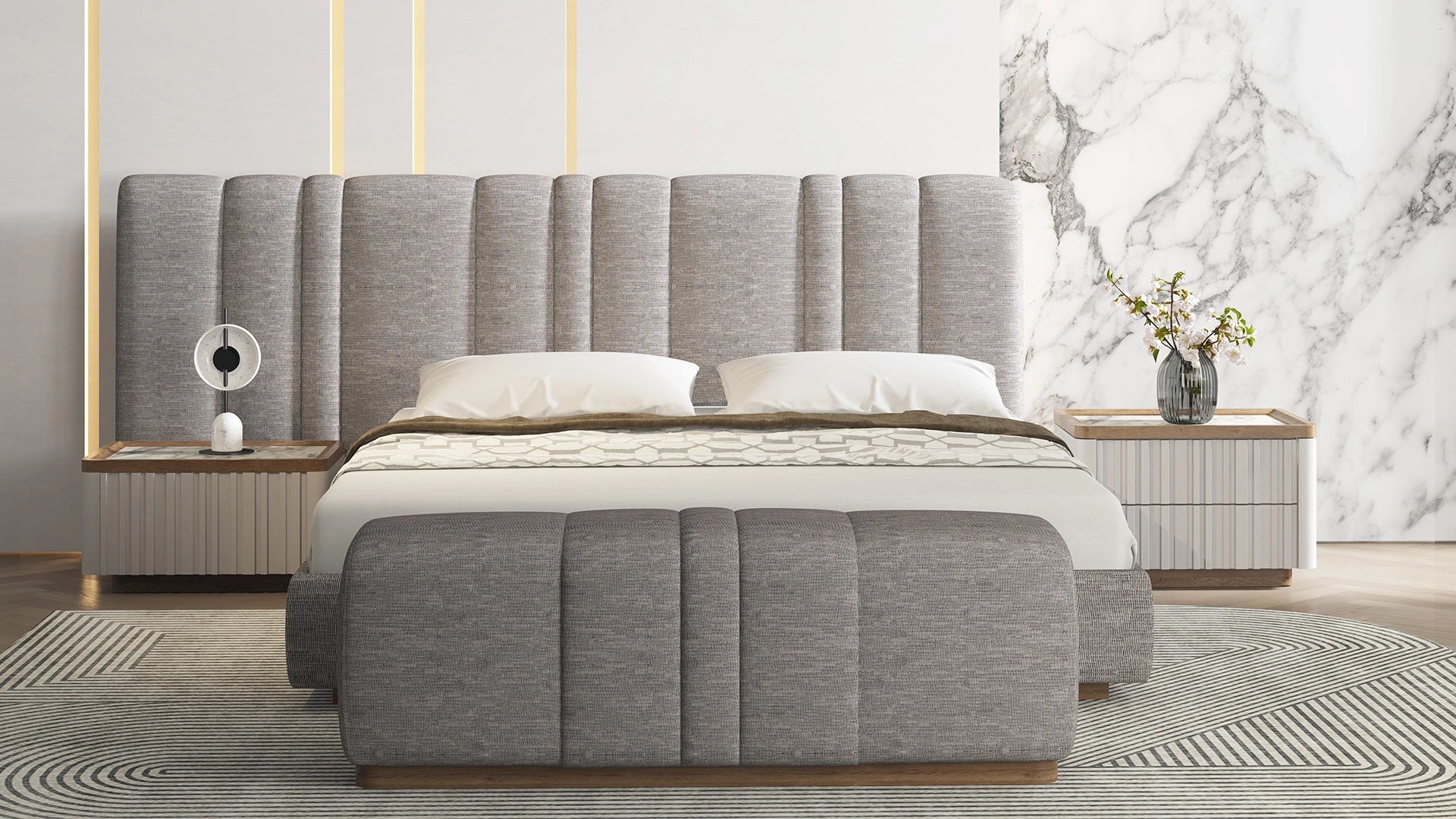 Zarif dikiş detaylarıyla dikkat çeken Lionte Ayakucu Puf, keten dokulu gri kumaş döşemesi ve cevizin şık birlikteliğini yatak odanıza taşıyor.