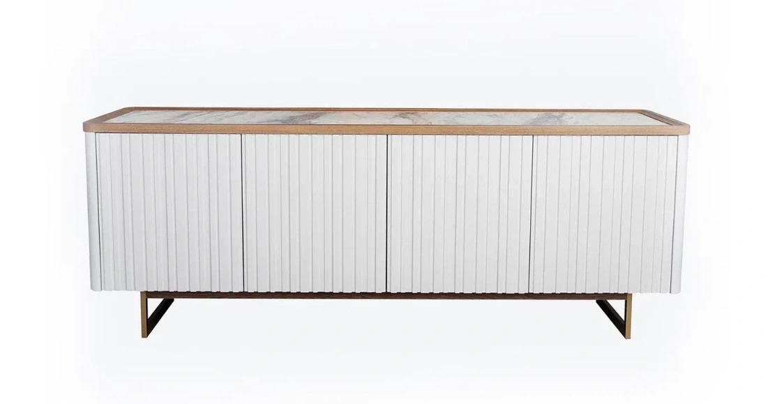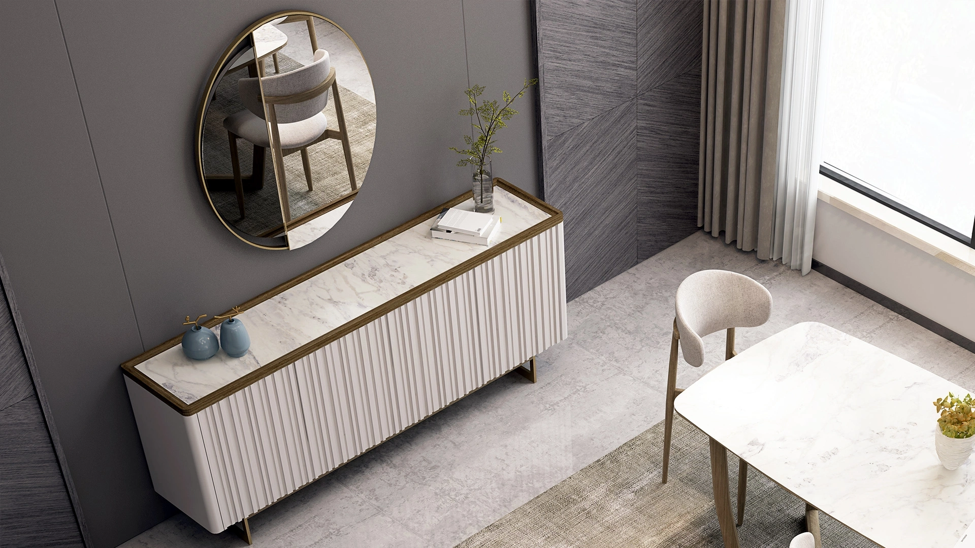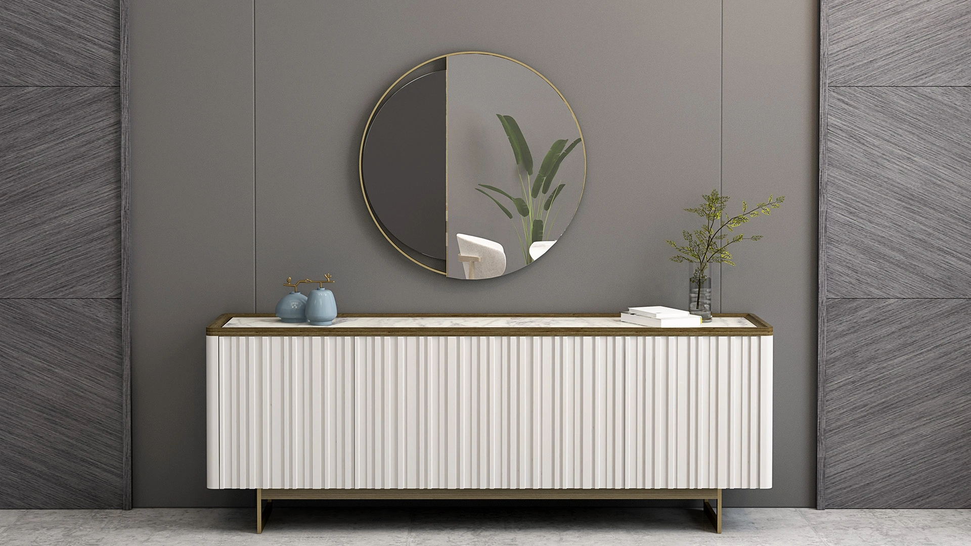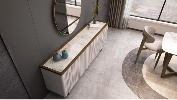 Frezya mermer deseni ile dikkat çeken Lionte Konsol, eskitme metal ayrıntılarıyla zarafeti ve şıklığı evinize taşıyor. Yuvarlatılmış köşeleri ile güvenli kullanım sunan Lionte Konsol, çekmecesinde bulunan flok kaşıklık ve raflı iç hacmiyle, yemek takımlarınız için harika bir alan sağlıyor.