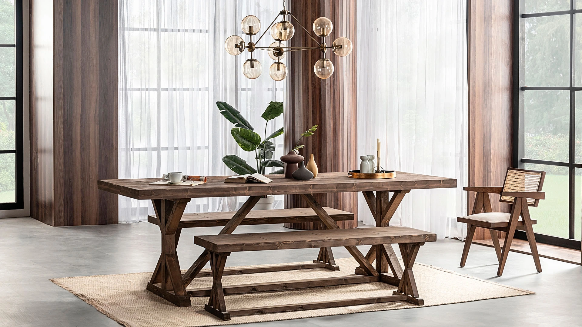 Masa, bench ve sehpadan oluşan Vista Masif Ahşap Masa Seti, country tarzıyla göz kamaştırıyor. Telleme işçiliği ile ahşabın doğal damarlı yapısının ortaya çıkarıldığı Vista Ahşap Masa Seti, doğanın eşsiz güzelliğini ve doğal masif ahşabın sıcaklığını yaşam alanlarınıza taşıyor.